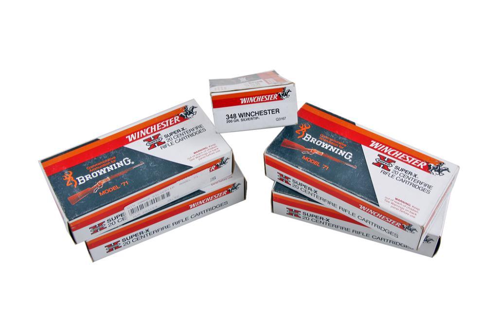 Lot of .348 Win Ammo Consisting of five full boxes of Winchester brand .348 cal ammo with 200 gr Silvertip bullets. Contained in boxes marked "Commemorative Ammunition for Browning Model 71".Consisting of five full boxes of Winchester brand .348 cal ammo with 200 gr Silvertip bullets. Contained in boxes marked "Commemorative Ammunition for Browning Model 71".