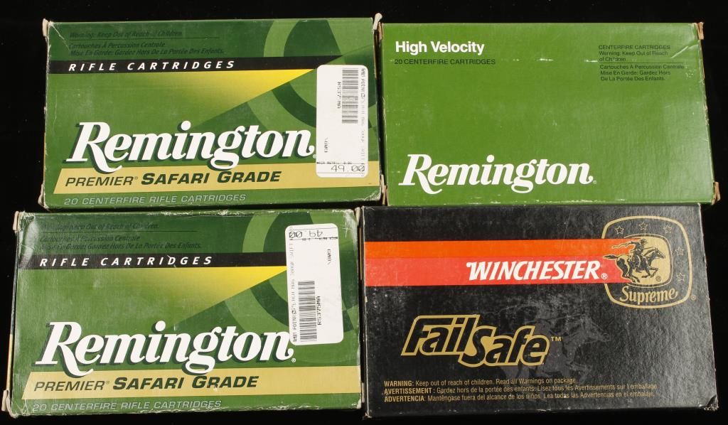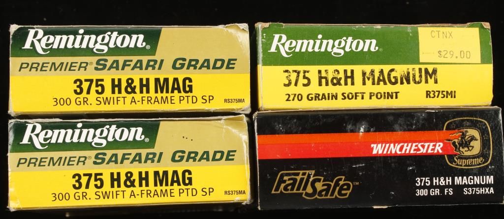 Three full boxes (20 rounds/box) and one box with 9 spent cases of .375 H&H and a few spent cases of .300 Win Mag.
