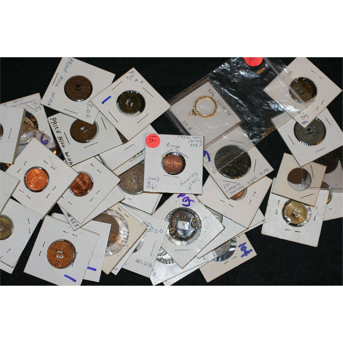 Lot of 38, Mixed US & Foreign Coins and Tokens various dates and conditions, Plus 14k Bezel Coin Holder