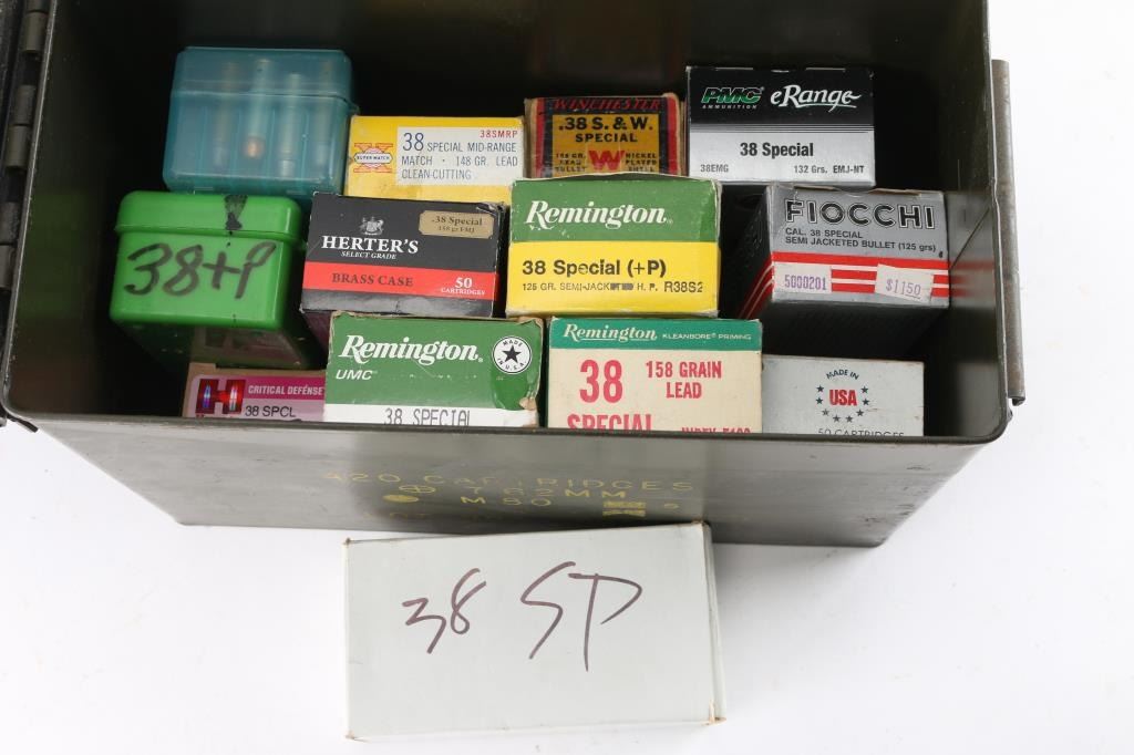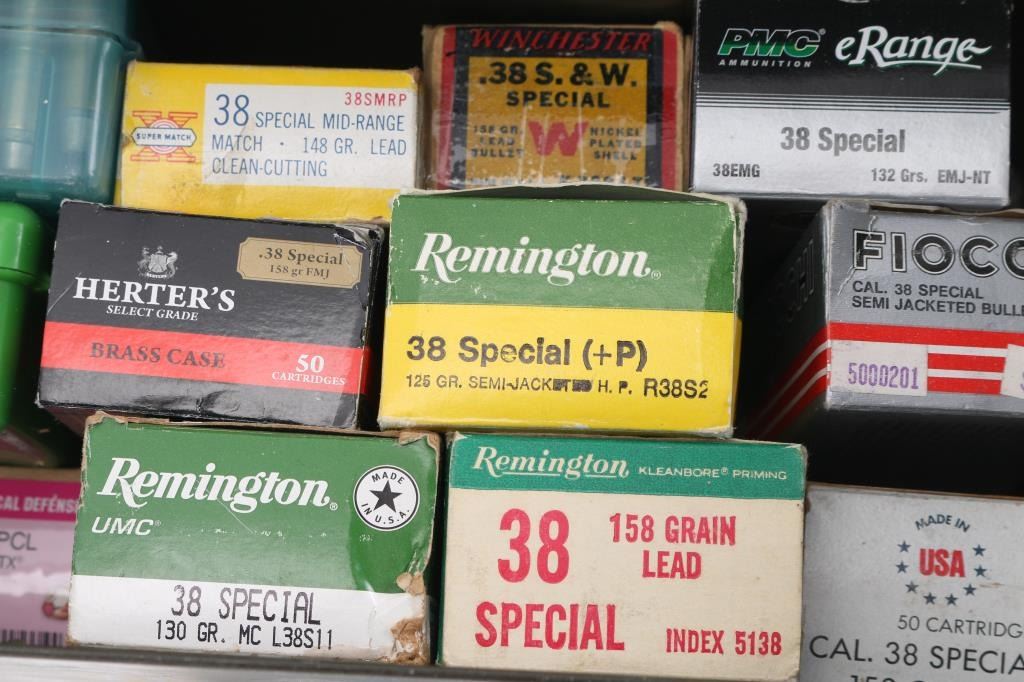 Approx. 500 rounds of 38 Special factory new & reloaded ammunition. approx. 400 rds of Remington, various loads; Fiocchi 125 Gr. semi-jacketed; PMC 132 Gr. EMJ & many others in partial boxes. Most in factory boxes and some in plastic cases.