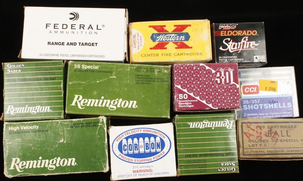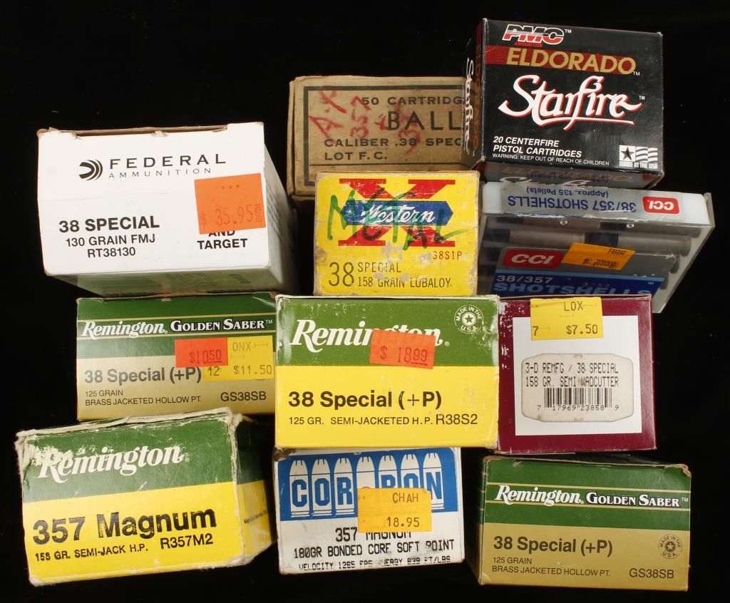 various makers. 200+ rounds of .38 Special and .38 Special (+P). 60 rounds of .357 Magnum. 8 rounds of 38/357 Shotshells.