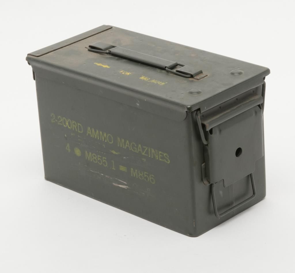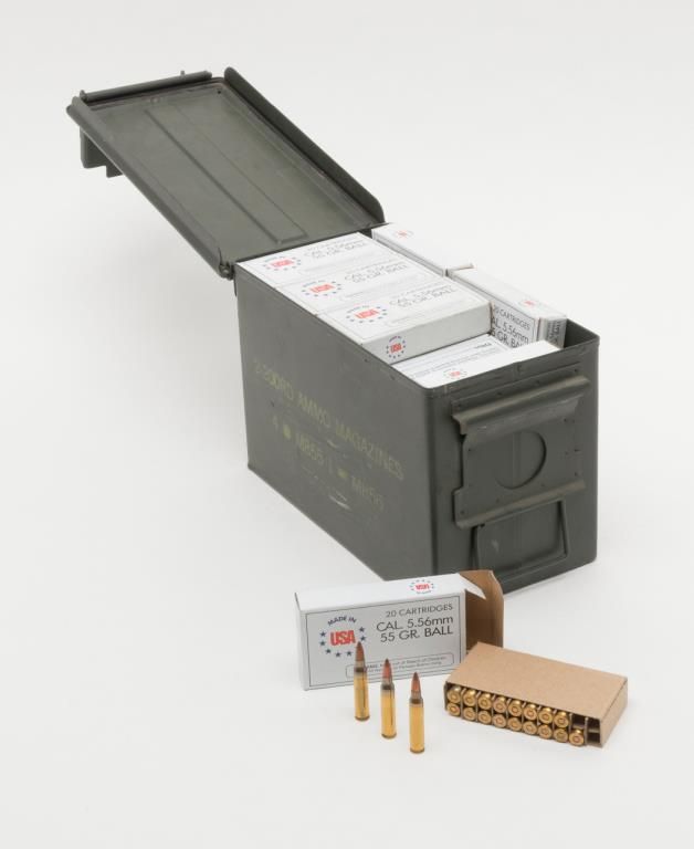 Lot of 39 boxes of 5.56mm cartridges, some partials, in green metal military carry can. Est.: $150-$250.