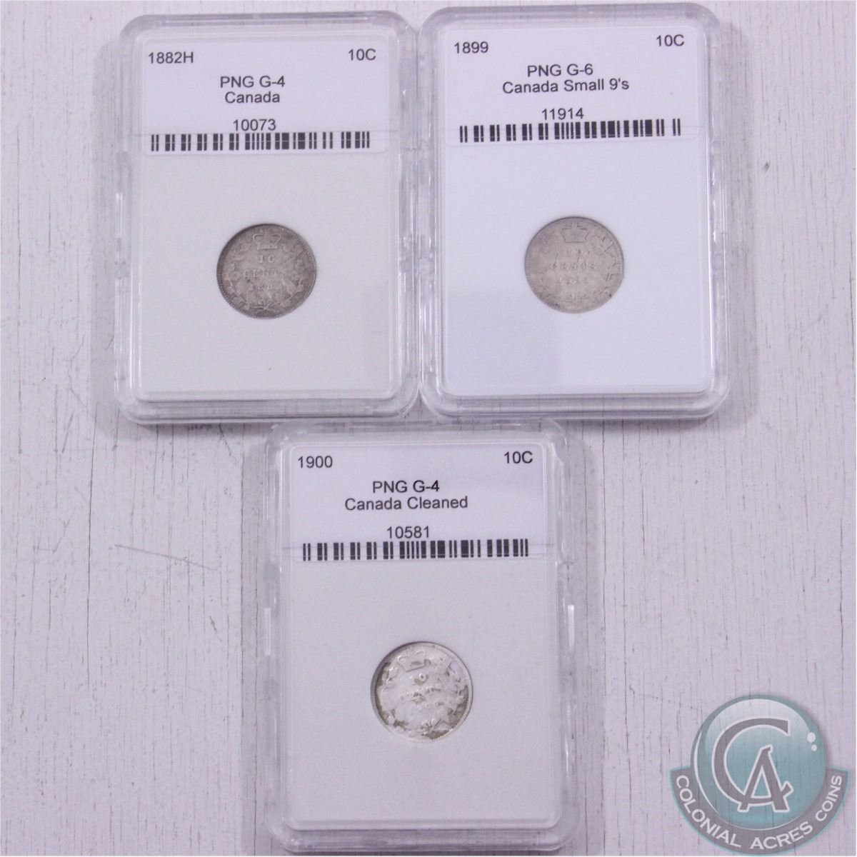 Lot of 3x 1882-1900 Canadian 10-cent PNG Certified Coins. You will receive the following dates and conditions: 1882H in G-4, 1899 Small 9's in G-6 and 1900 in G-4. Please note that the 1899 is scratched and the 1900 contains residue. Coins come encapsulated in PNG protective casing. (4pcs)