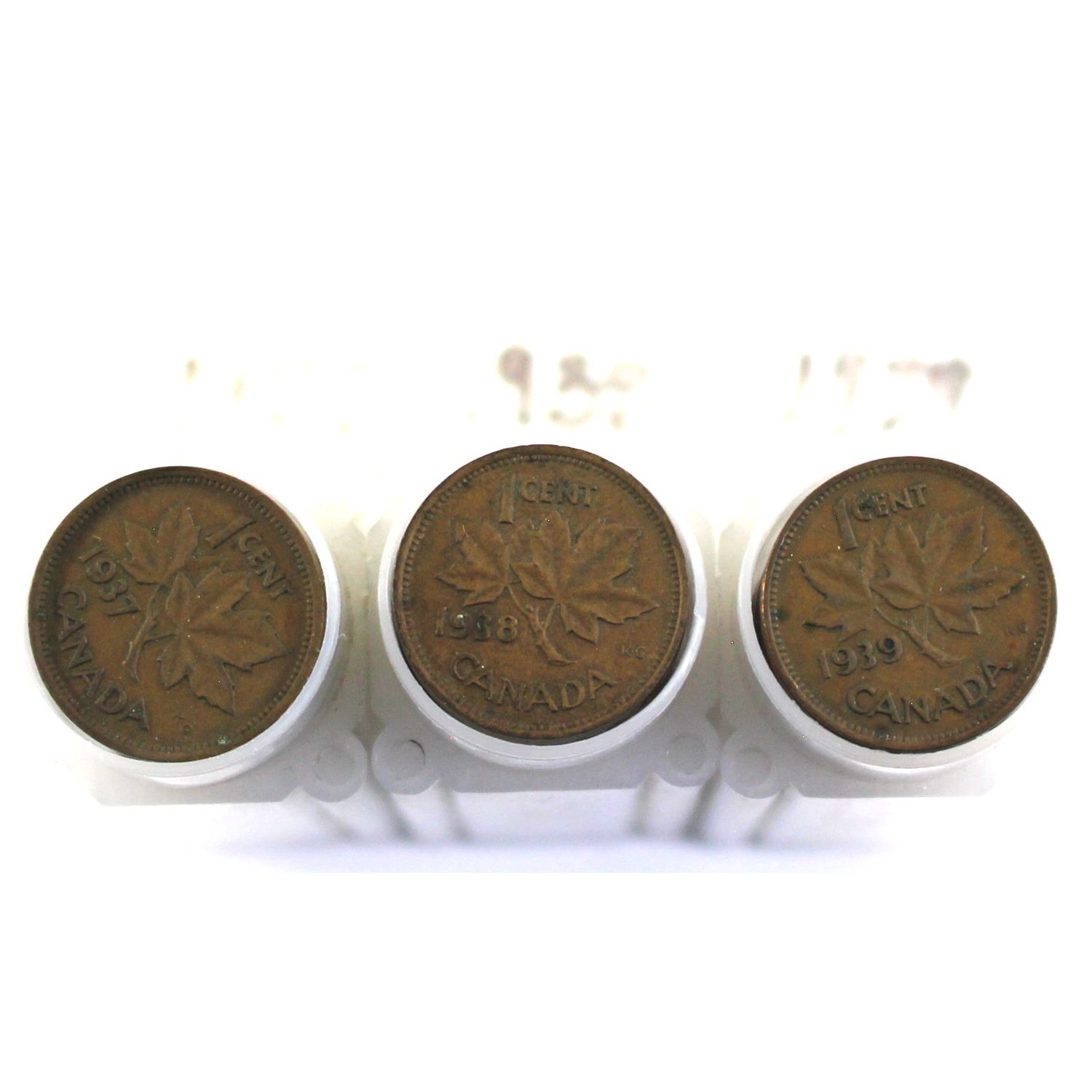 Lot of 3x 1937-1939 Canada 1-cent Rolls in Tubes. Average condition. You will receive one of each year. 3 Rolls.