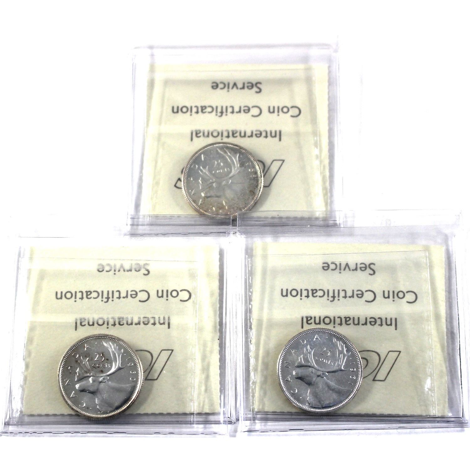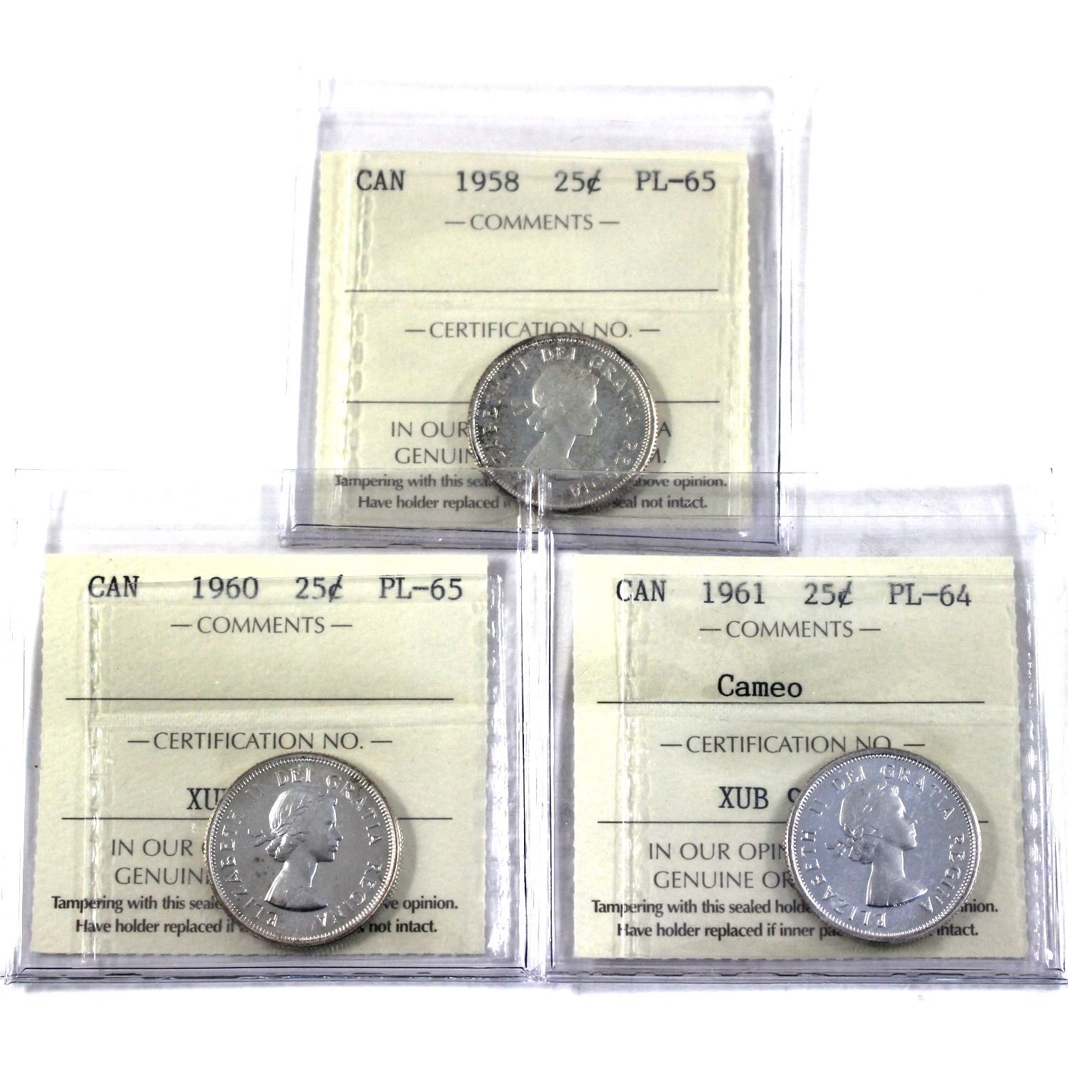 Lot of 3x 1958-1961 Canada 25-cent ICCS Certified PL-64 to PL-65. Lot Includes: 1958 PL-65; 1960 PL-65; & 1961 PL-64, Cameo. 3pcs.
