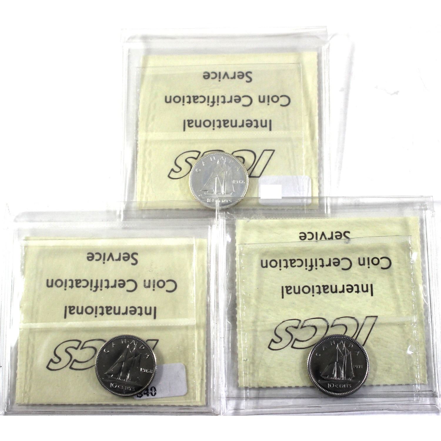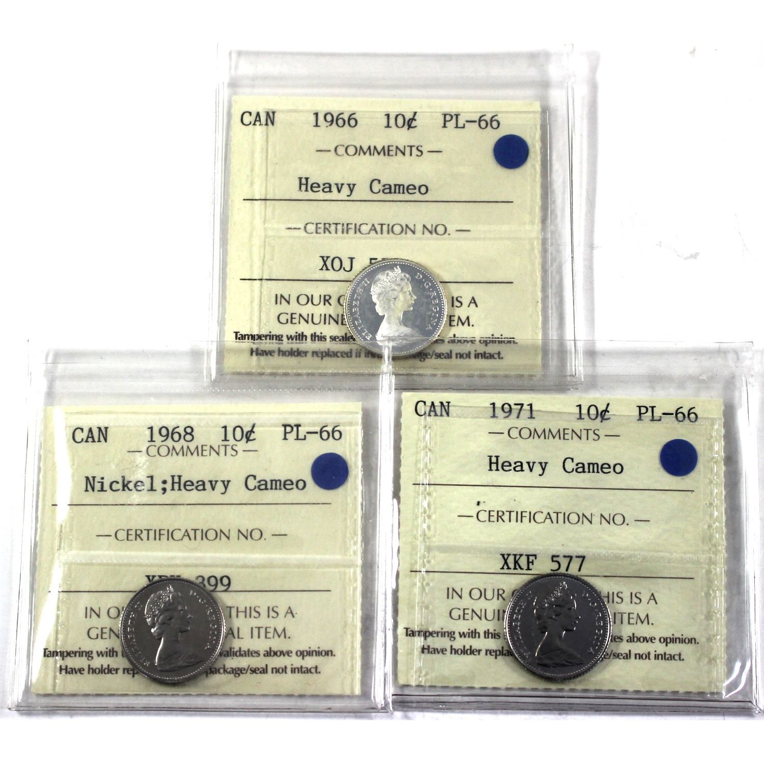 Lot of 3x 1966-1971 Canada 10-cent ICCS Certified PL-66, Heavy Cameo. Lot Includes:1966; 1968-Nickel; & 1971. 3pcs.