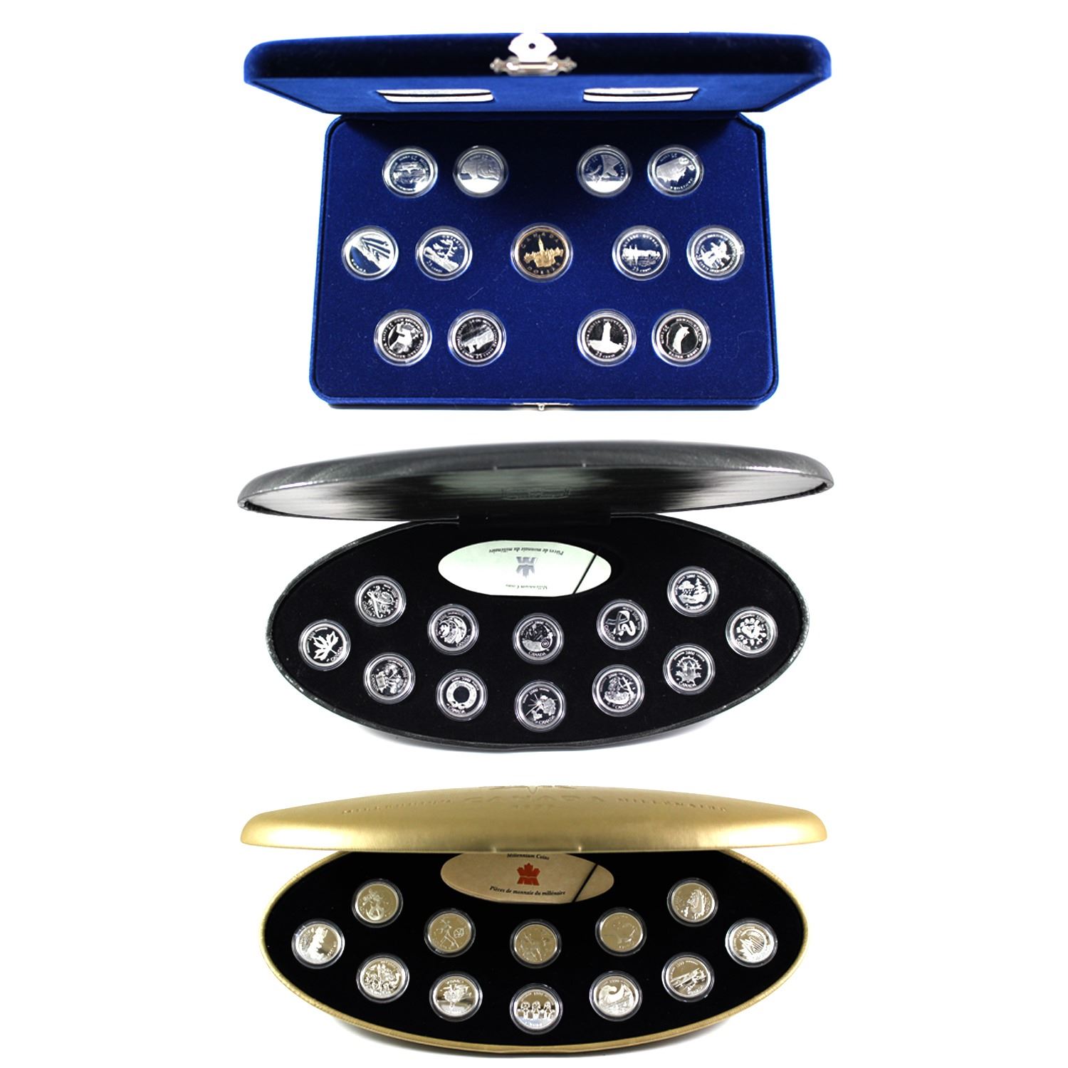 Lot of 3x 1992, 1999 & 2000 Canada 25-Cent Sterling Silver 12 Coin Sets. Includes 1992 Provinces Set (plus Parliament Loon!), 1999 Millennium Set, and 2000 Millennium Set. Coins and packaging have various imperfections but many are minor. One noticeable cracked capsule.