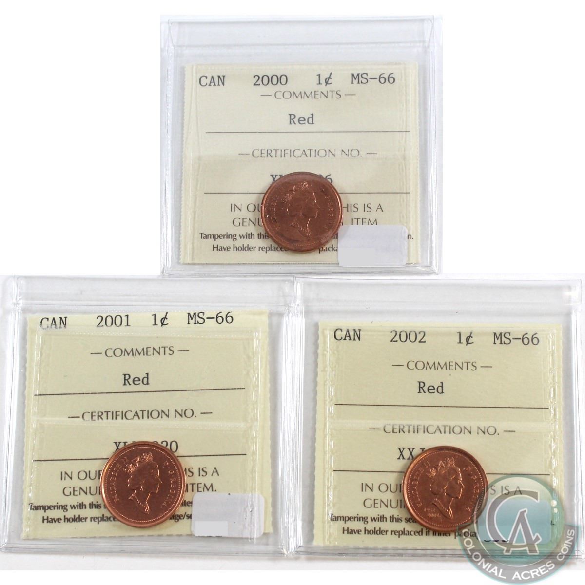Lot of 3x 2000-2002 Canada 1-cent ICCS Certified MS-66. 3pcs