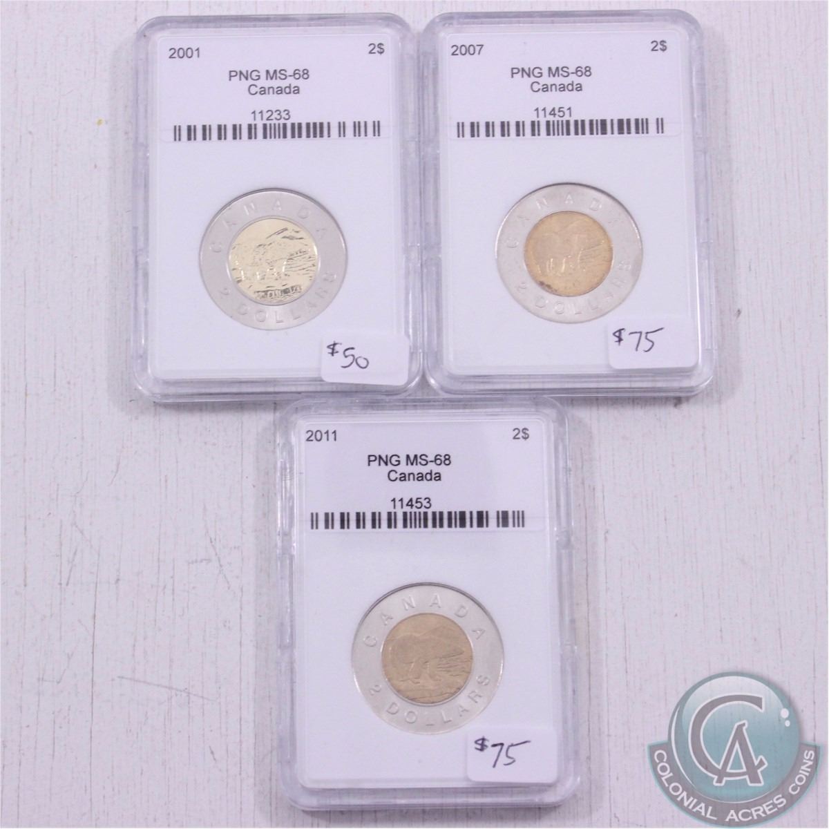 Lot of 3x 2001-2011 Canadian $2 PNG Certified Coins in MS-68. The dates you will receive are: 2001, 2007 and 2011. Coins are encapsulated in a PNG protective case. (3pcs)