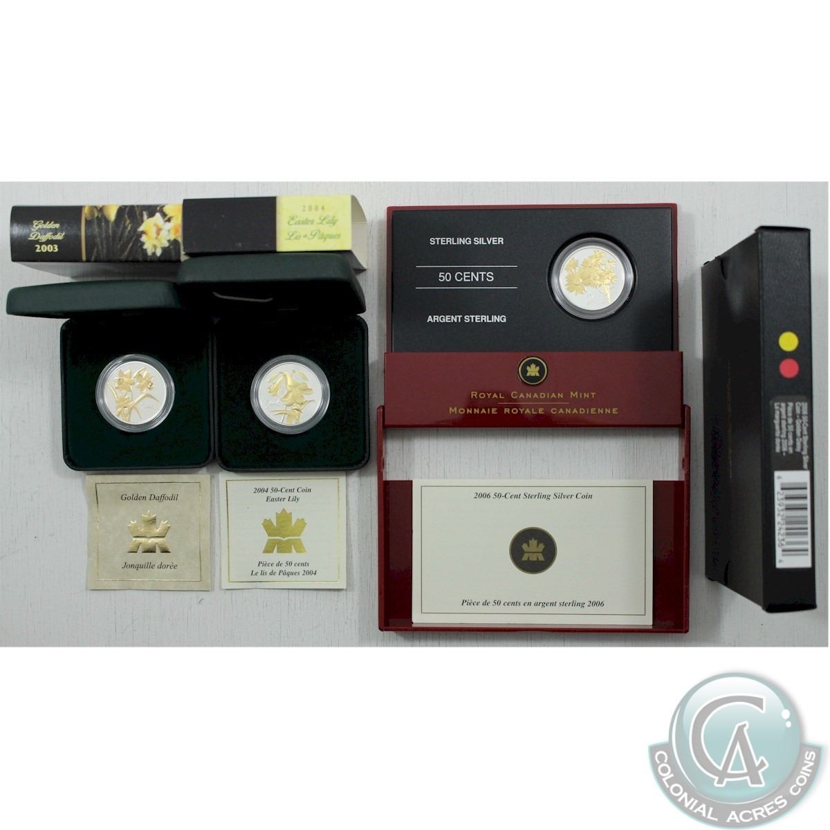 Lot of 3x 2003, 2004 and 2006 Canada Floral Collection Silver 50-cent coins. This lot includes the 2003 Golden Daffodil Sterling Silver, 2004 Golden Easter Lily Sterling Silver and the 2006 Golden Daisy Sterling Silver Coin. Each coin comes in their original mint packaging (3 pcs)