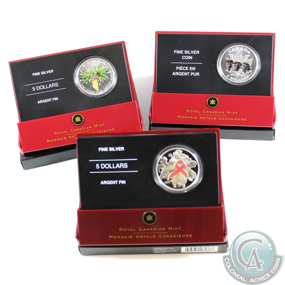 Lot of 3x 2005-2006 Canada $5 Fine Silver Coins - 2005 60th Anniversary of the End of World War II, 2005 1oz Coloured Maple (light toning) & 2006 Pink Ribbon (capsule scratched & coin is toned). 3pcs (TAX Exempt)