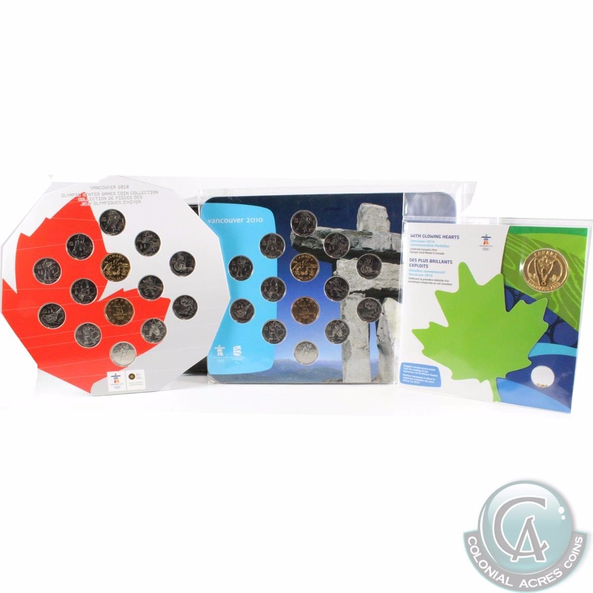 Lot of 3x 2007-2010 Canadian Collector Coin Sets Commemorating the 2010 Vancouver Olympics. The sets you will receive are the: Official RCM 2007-2010 Collector Board, 2010 RCM Inuksuk Coin Collector Board, and 2010 RCM Olympic Medallion - "With Glowing Hearts" First Olympic Gold Commemorative Medallion and Nuggets. (3pcs)