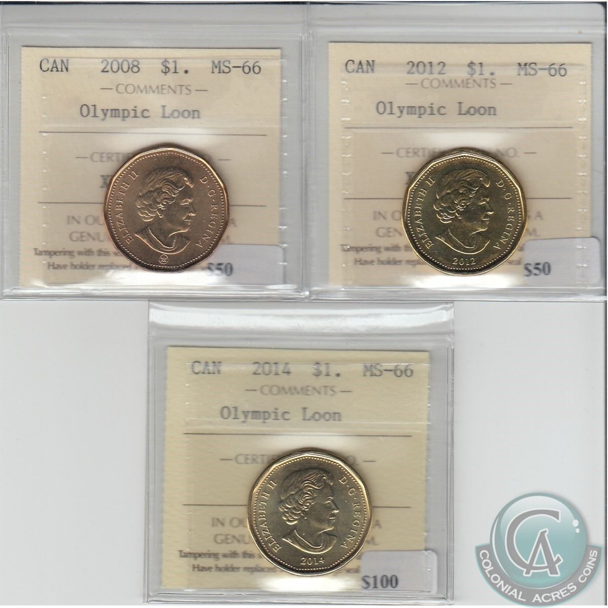 Lot of 3x 2008, 2012 & 2014 Olympic Loon Dollars all ICCS Certified MS-66 (3pcs)