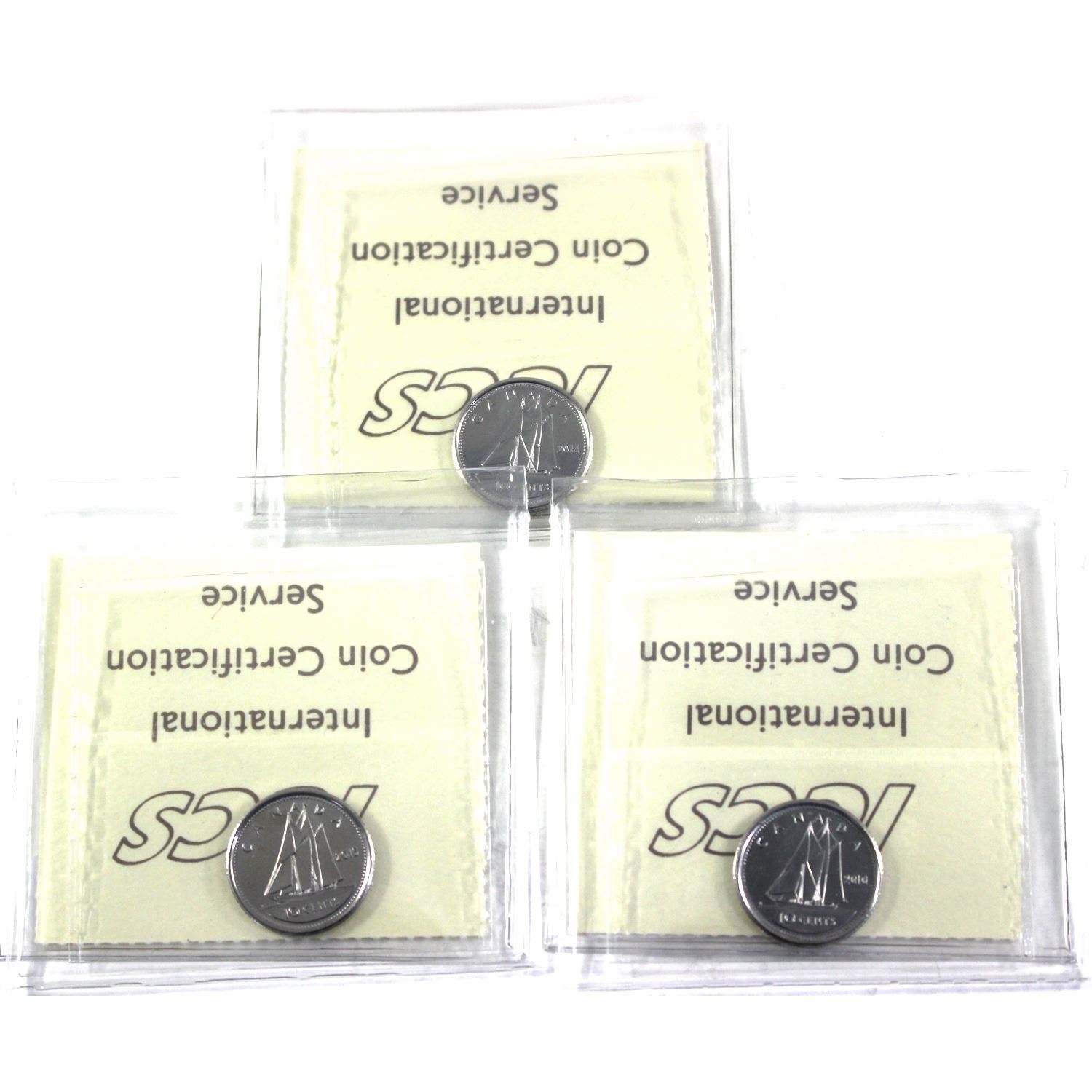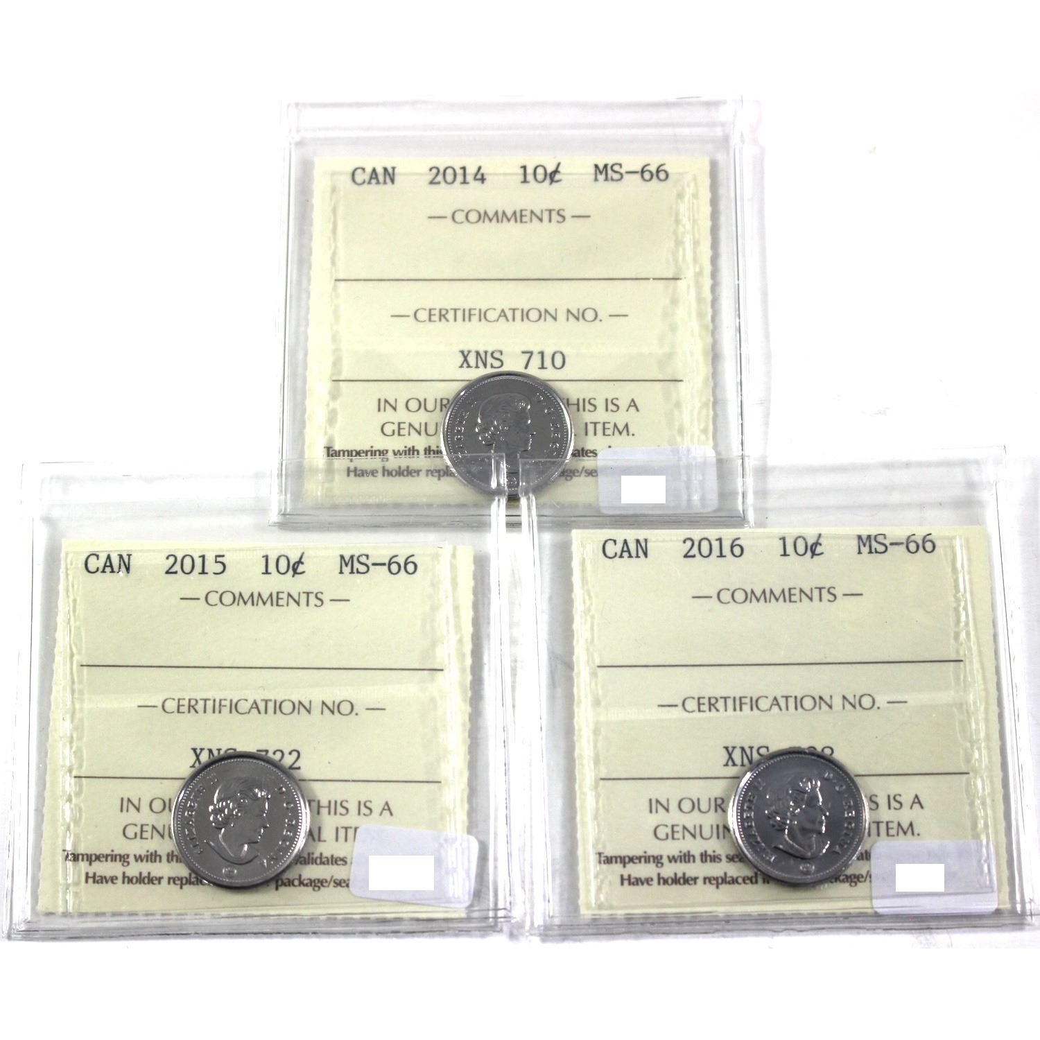 Lot of 3x 2014-2016 Canada 10-cent ICCS Certified MS-66. Lot Includes: 2014, 2015, & 2016. 3pcs.