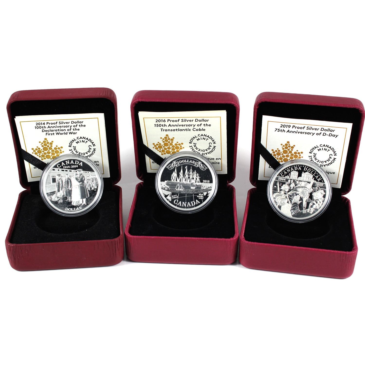 Lot of 3x 2014-2019 Canada Proof Silver Dollars. Includes 2014 100th Anniversary of the Declaration of WWI, 2016 150th Anniversary of the Transatlantic Cable, and 2019 75th Anniversary of D-Day. Comes with encapsulated coins, COAs, and clamshell cases.