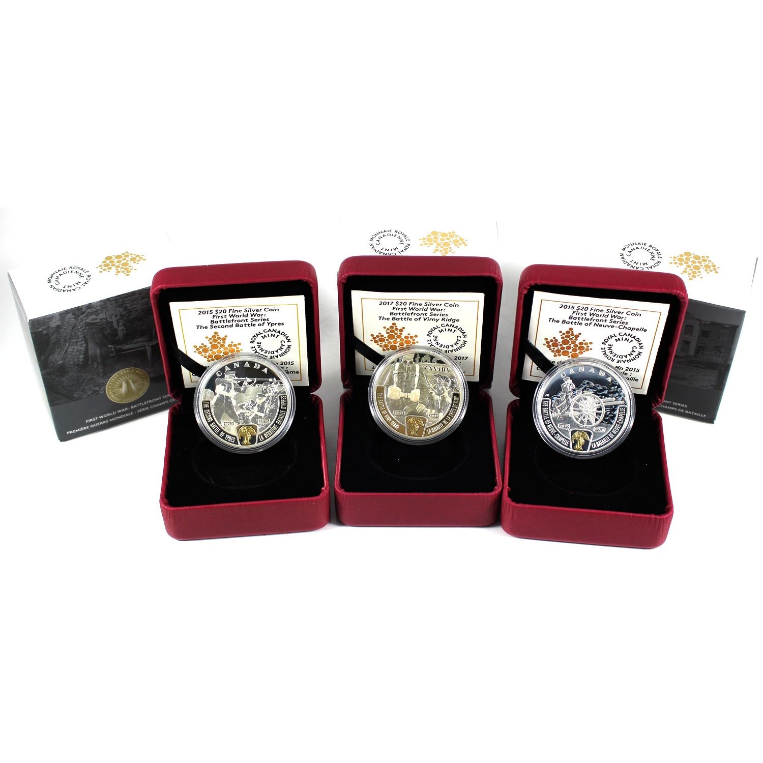 Lot of 3x 2015 & 2017 Canada $20 The Battlefront Series Fine Silver Coins. Includes 2015 Battle of Neuve-Chapelle, 2015 The Second Battle of Ypres, and 2017 The Battle of Vimy Ridge. Lightly toned.