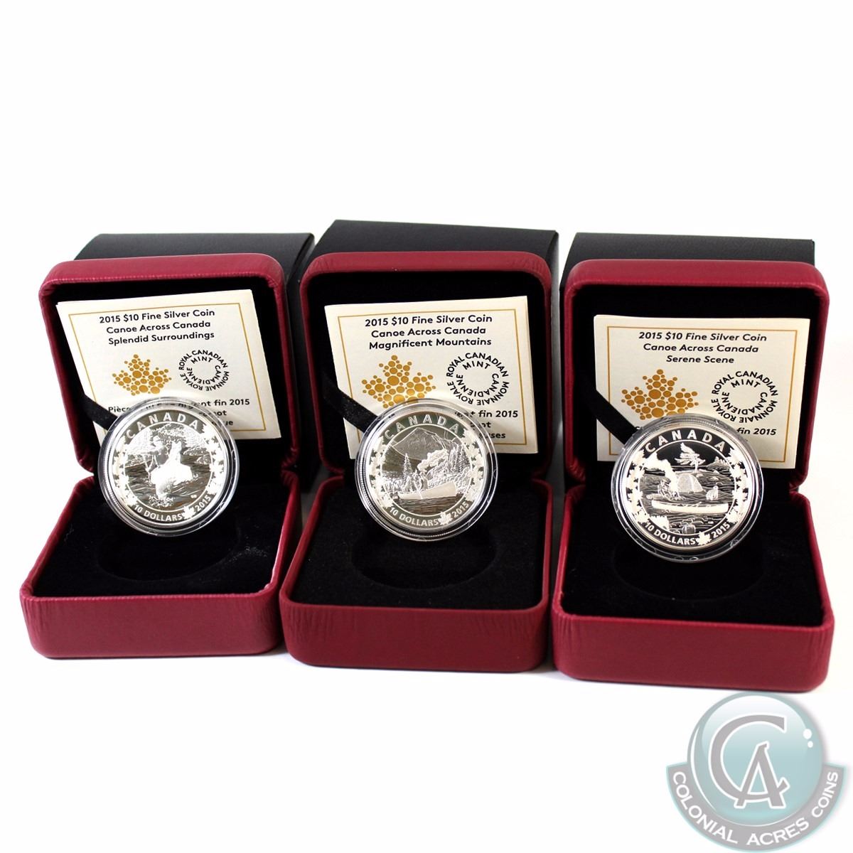 Lot of 3x 2015 Canada $10 Canoe Across Canada Fine Silver Coins - Magnificent Mountains, Splendid surroundings (Capsule scratched on back) & Serene Scene. 3pcs (TAX Exempt)
