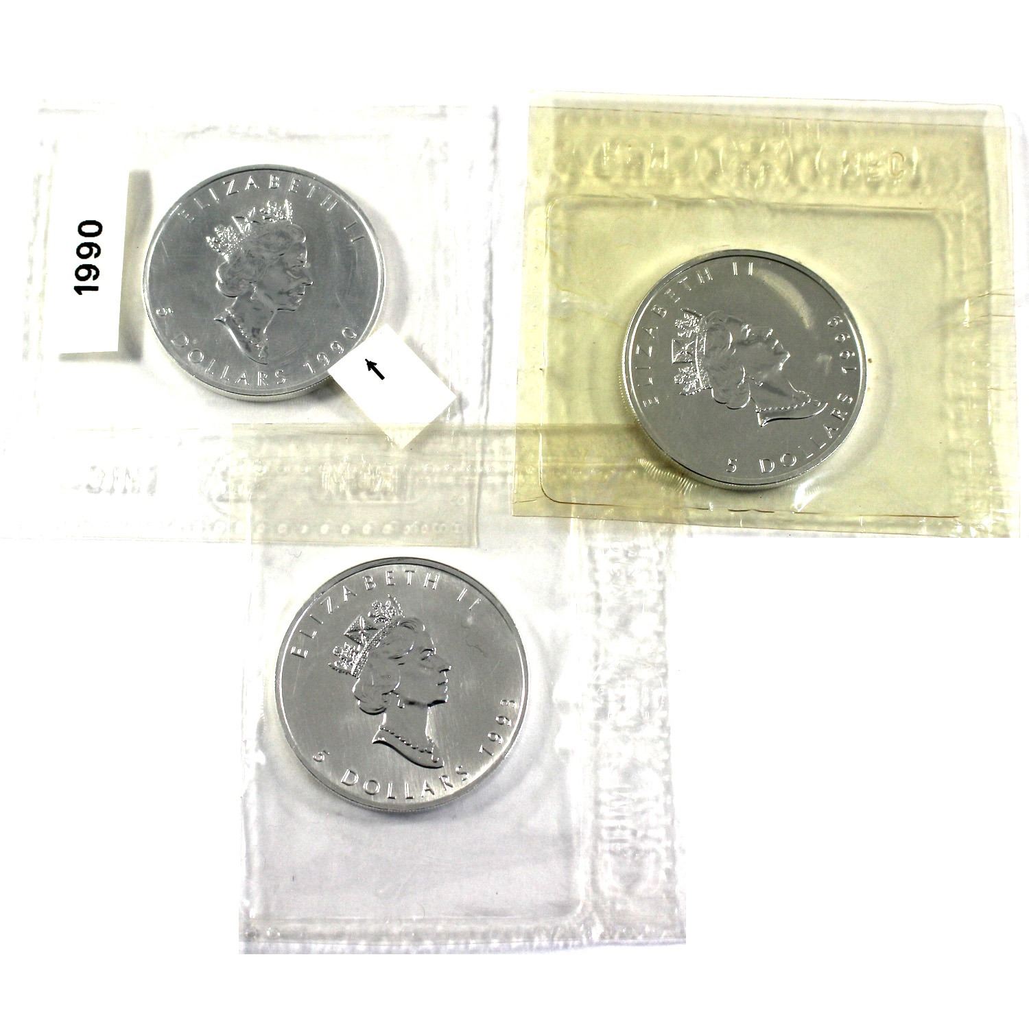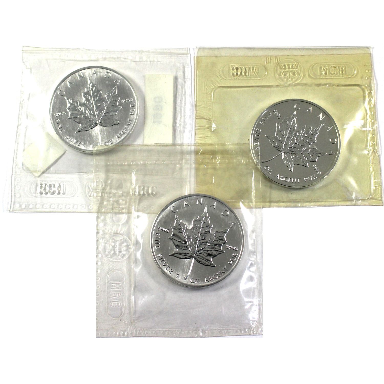 Lot of 3x $5 Canada 1oz Silver Maple Still sealed in Mint Pliofilm. Lot includes: 1990, 1993, & 1999. 3pc (Tax Exempt)