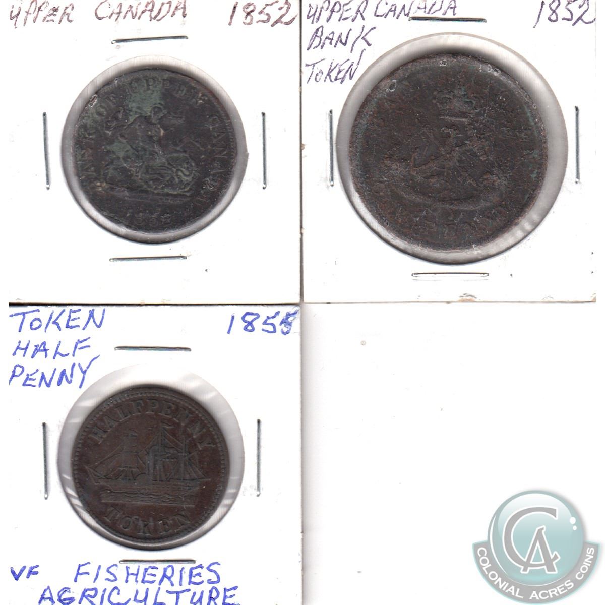 Lot of 3x Bank Tokens: 1852 Bank of Upper Canada Half Penny, 1852 Upper Canada One Penny, & 1855 Fisheries and Agricultures Half Penny Token. 3pcs