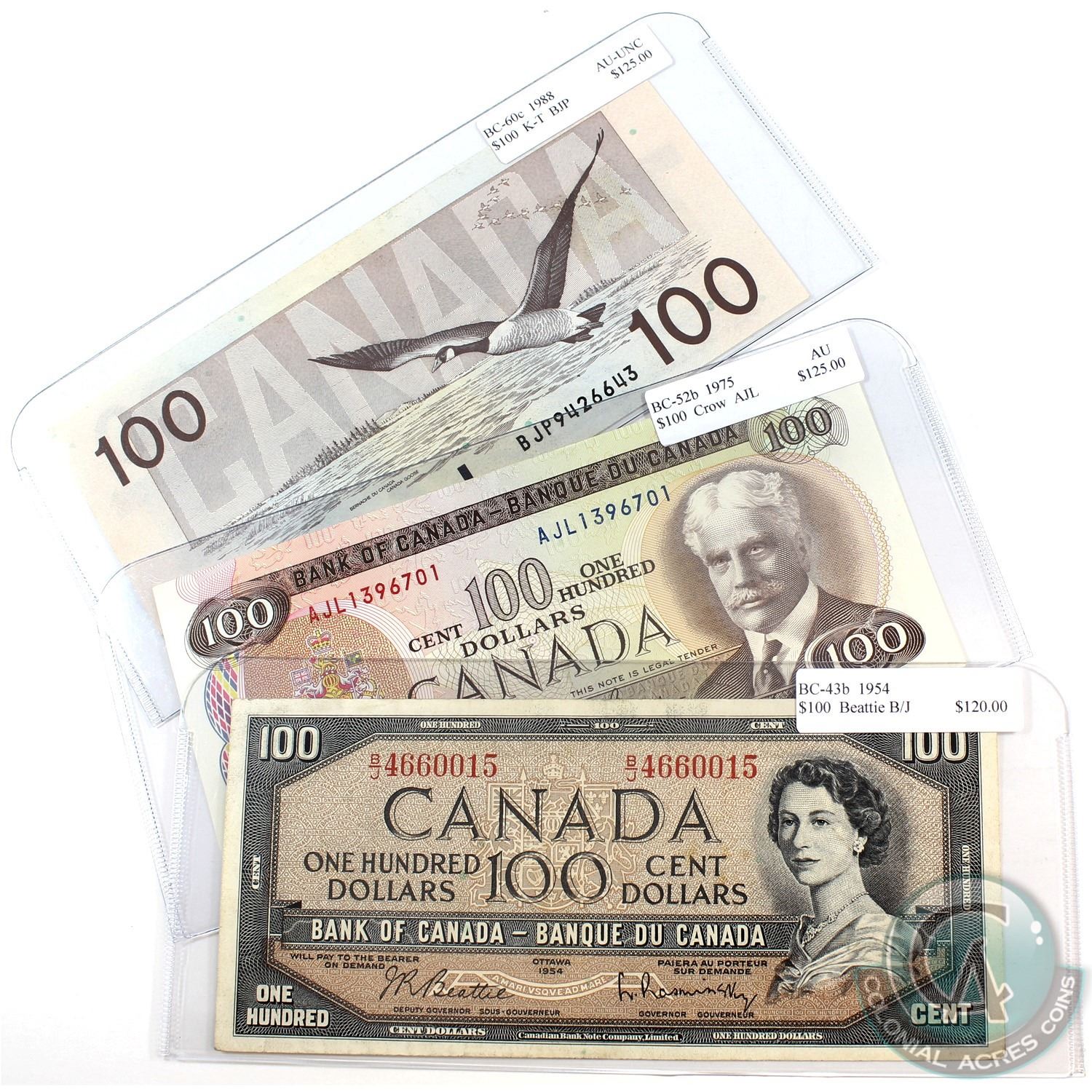 Lot of 3x Bank of Canada $100 Notes - 1954 BC-43b prefix B/J, 1975 BC-52b prefix AJL & 1988 BC-60c prefix BJP. 3pcs