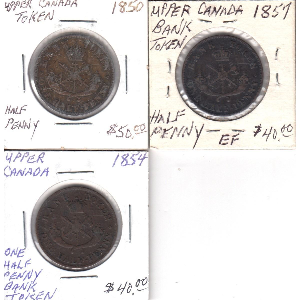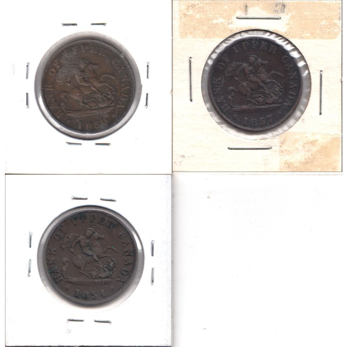 Lot of 3x Bank of Upper Canada Half Penny Tokens. This lot includes: 1850, 1854 & 1857. 3pcs