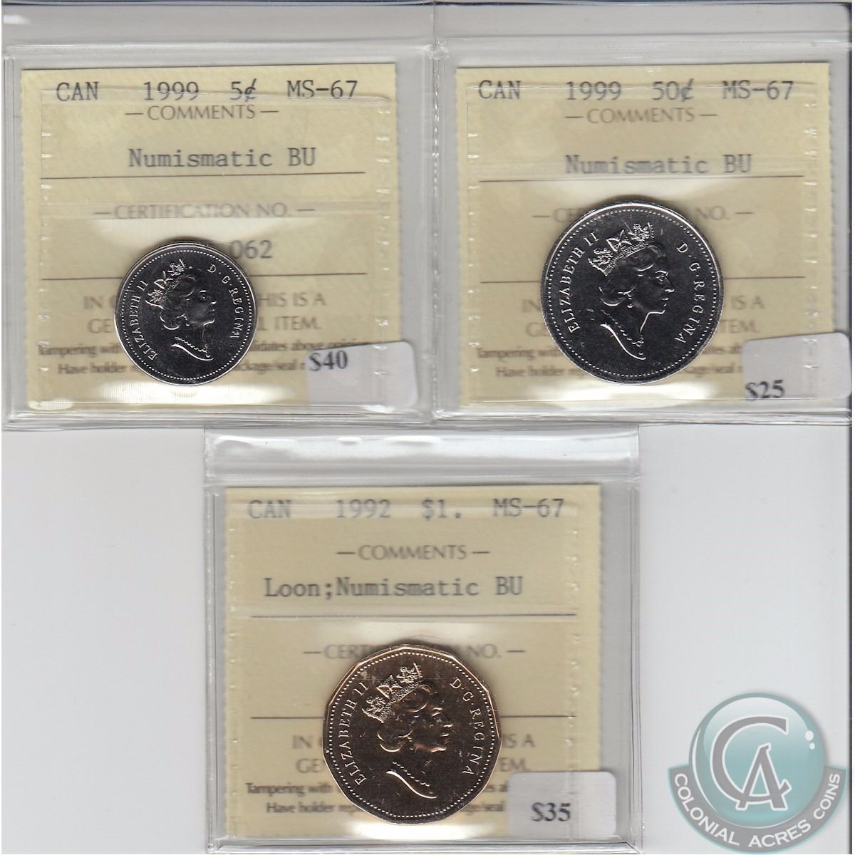 Lot of 3x Canada 1999 5ct, 1999 50ct & 1992 Loon $1 ICCS Certified MS-67; Numismatic BU (3pcs)