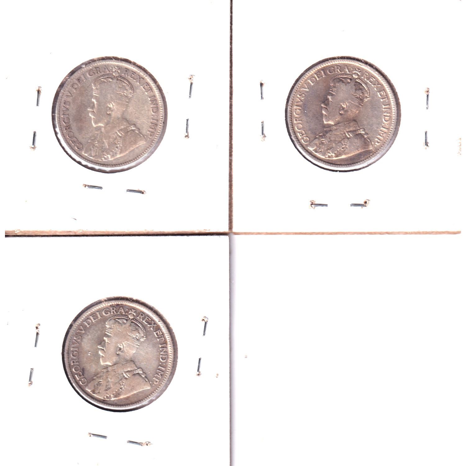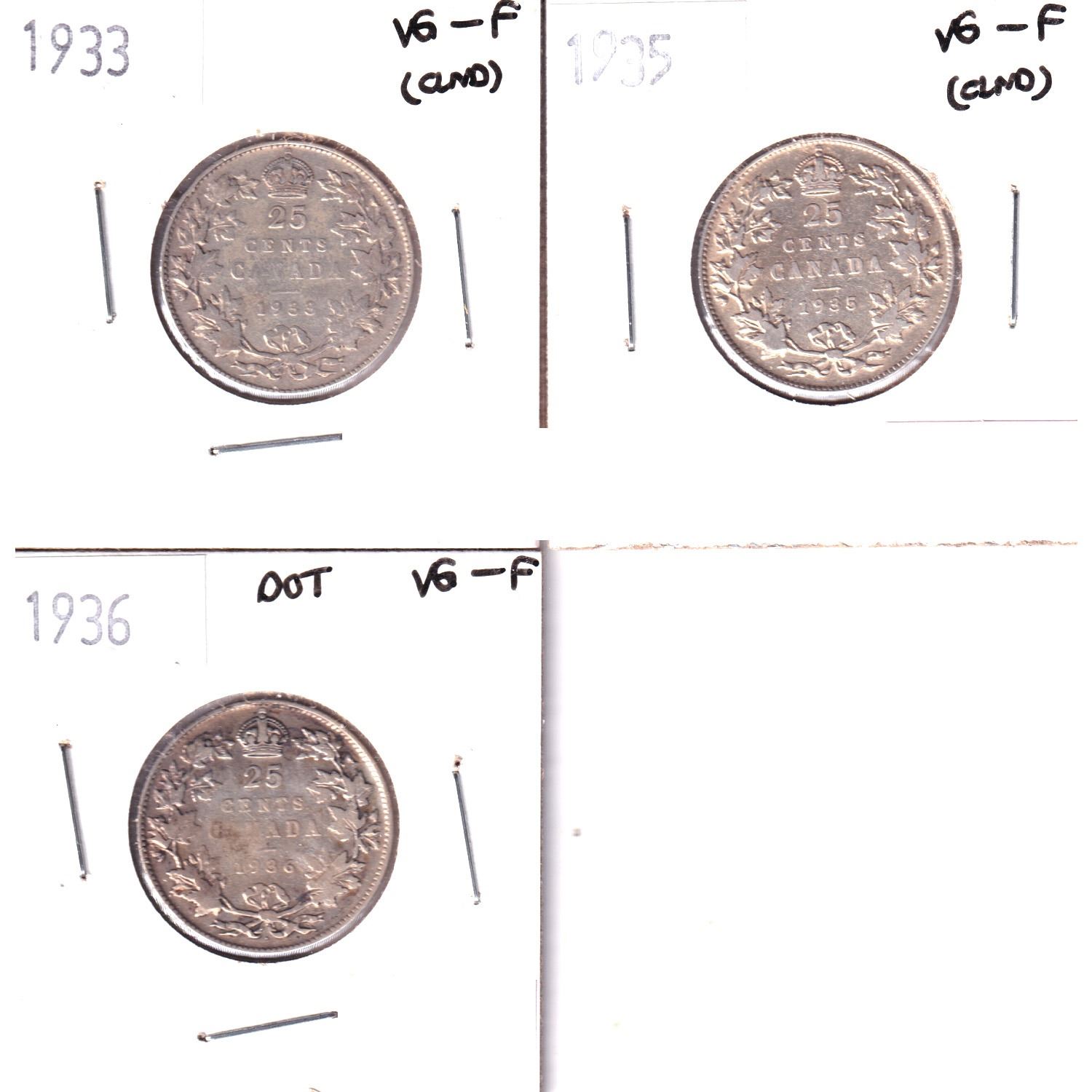 Lot of 3x Canada 25-cent Coins: 1933 VG-10 (cleaned), 1935 VG-10(cleaned) & 1936 Dot VG-10(cleaned). 3pcs