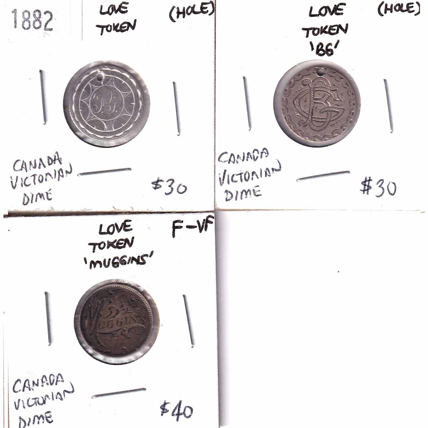 Lot of 3x Canada Victorian 10-cent Love Tokens. Inscribed on the Tokens are 'F.P.', 'B.G.' & 'Muggins'. 3pcs