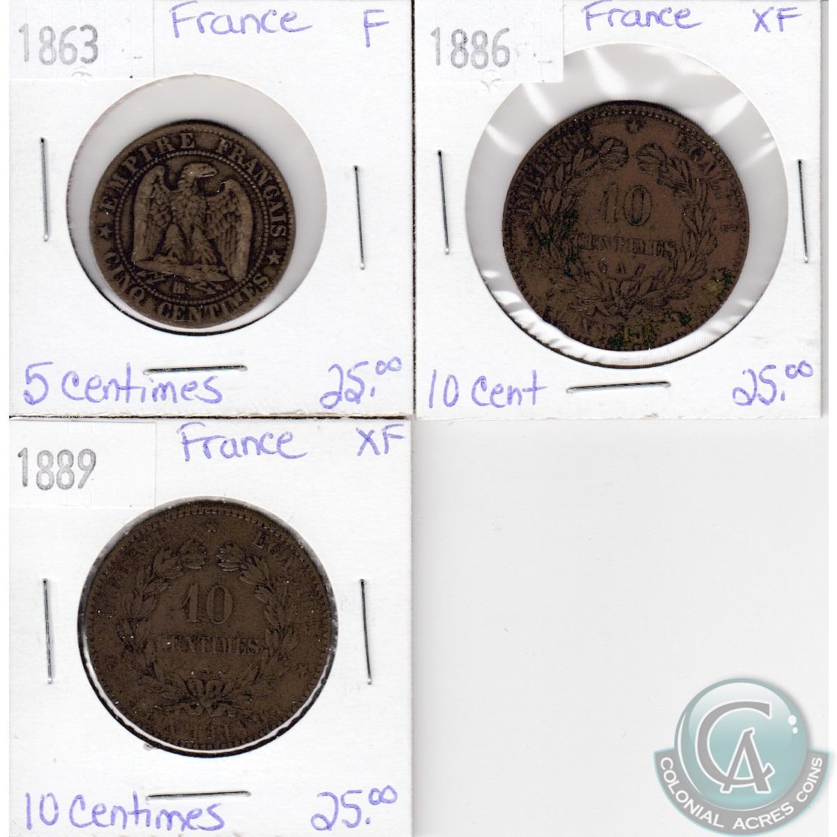 Lot of 3x France Coinage Dated 1863, 1886 & 1889 in F or XF as per holders. 3pcs