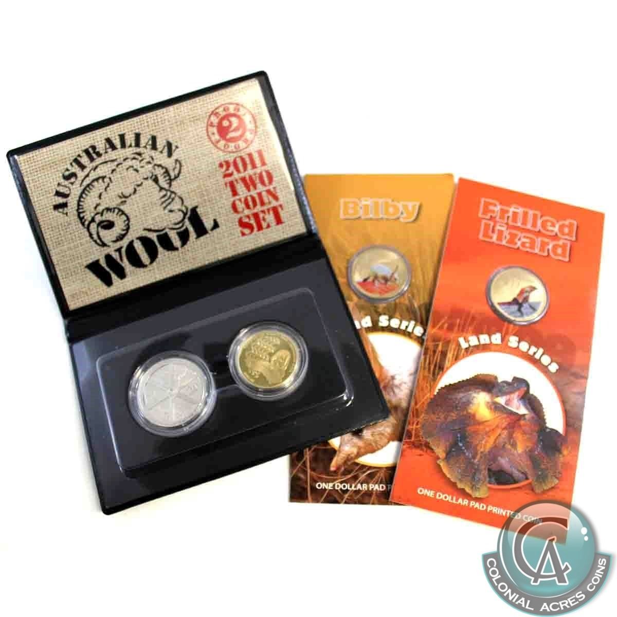 Lot of 3x Royal Australian Mint issued coins: 2009 Australia $1 Pad Printed Land Series - Bilby Coin, 2009 Land Series Frilled Lizard $1 Pad Printed Coin & 2011 Australian Wool 'Riding on the Sheep’s back' Proof 2 Coin 20c & $1 Set. 3 pcs
