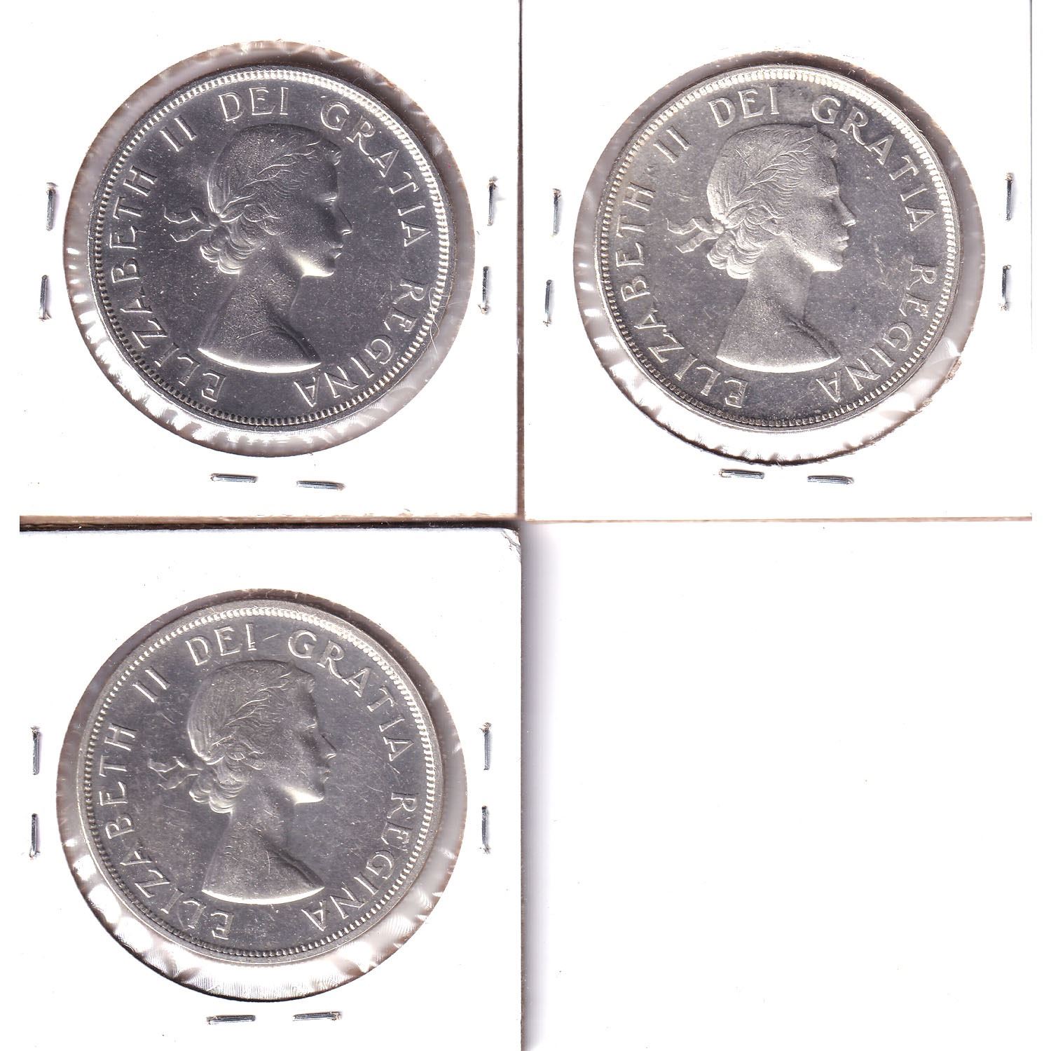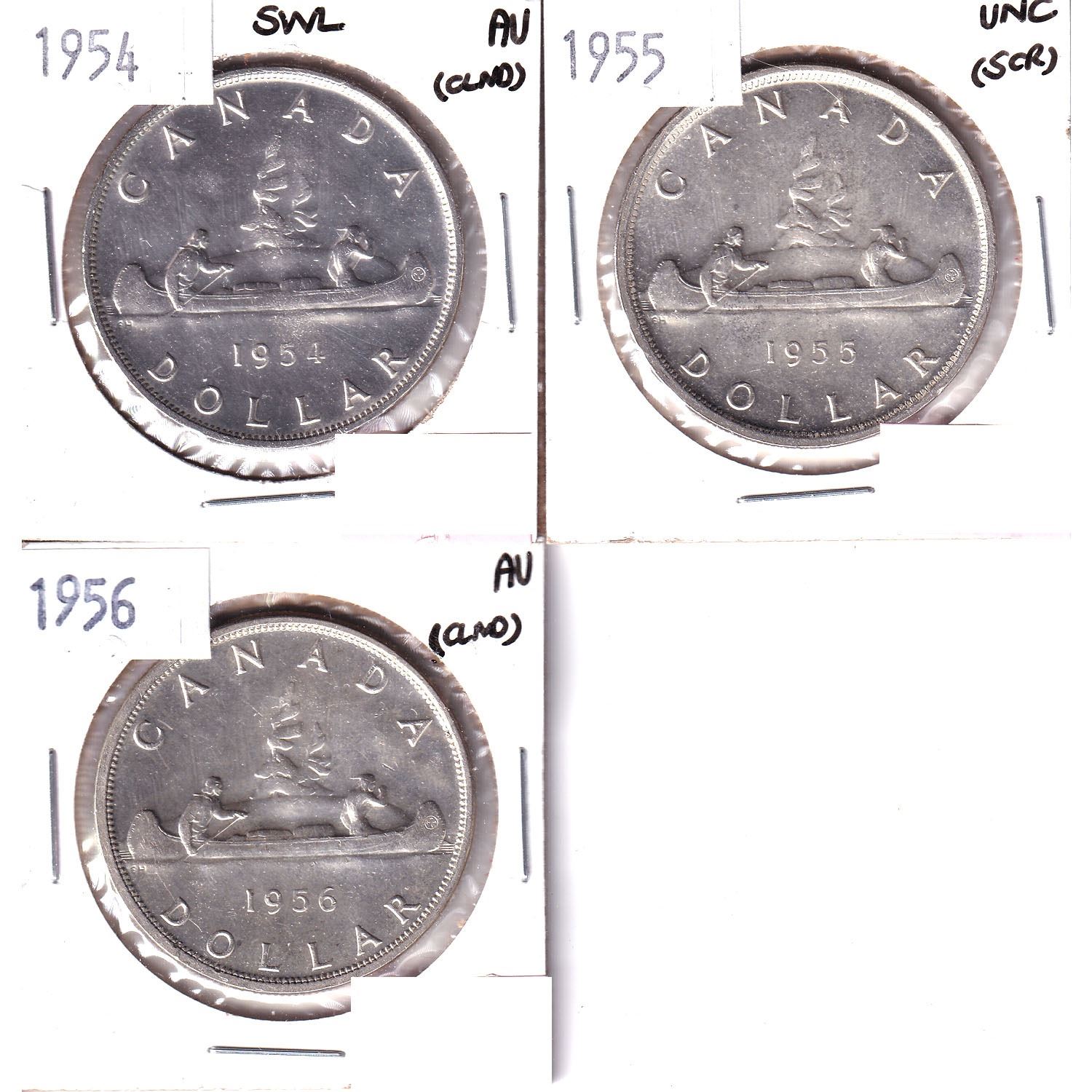Lot of 3x Silver dollars. Lot includes 1954 SWL, 1955, & 1956, some tougher Elizabeth II dates. All coins in AU or better condition. Coins may be lightly cleaned or impaired. 3pcs