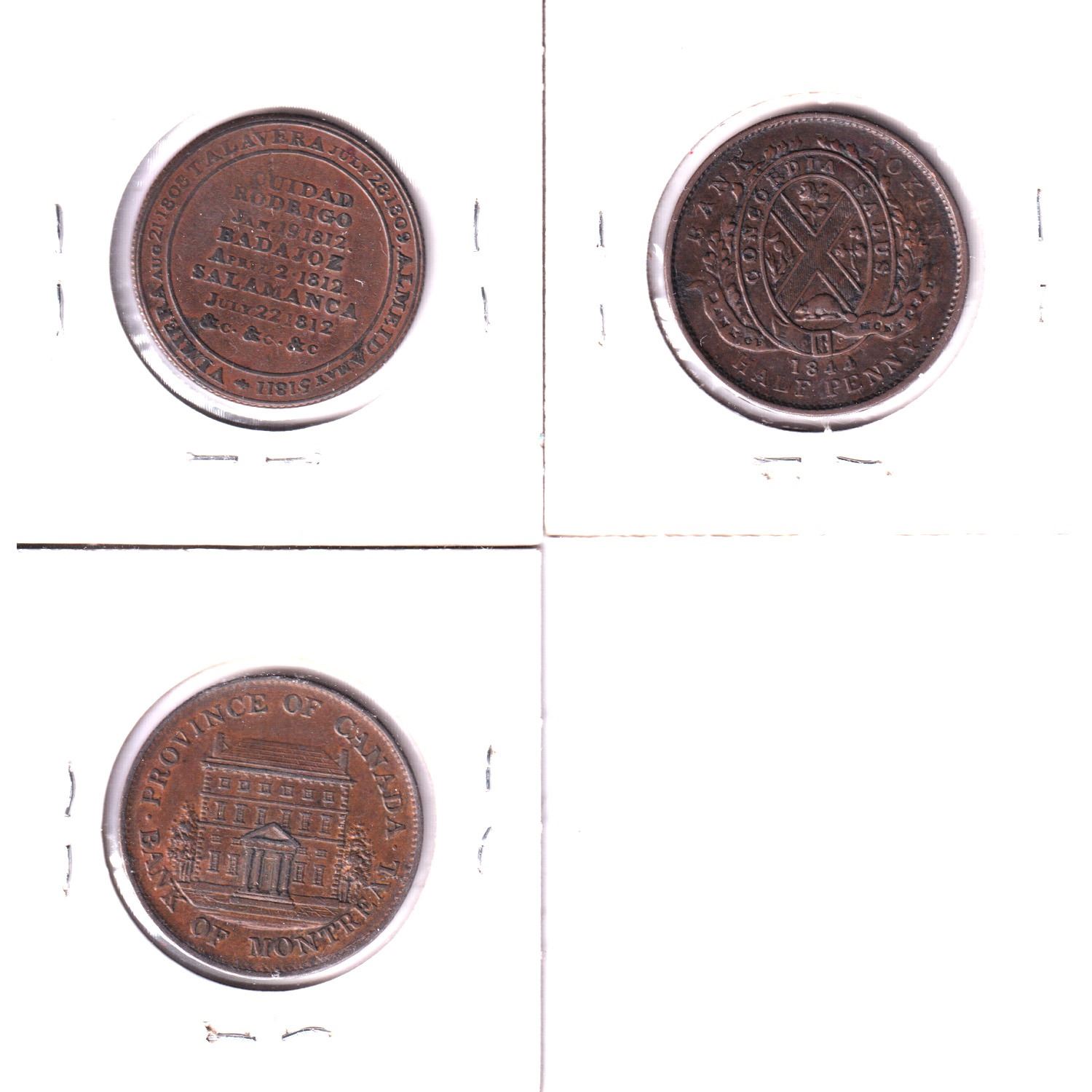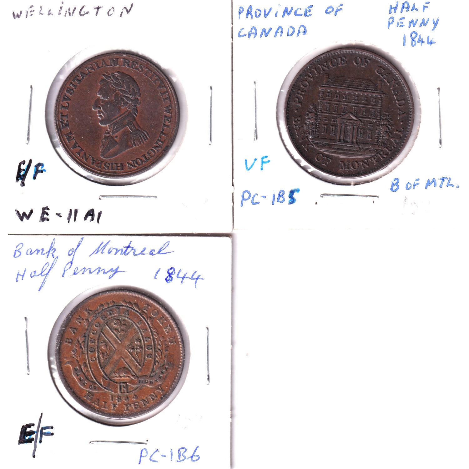 Lot of 3x bank tokens: Wellington WE11A1, 1844 PC-1B5 half penny & 1844 Bank of Montreal PC-1B6. 3pcs