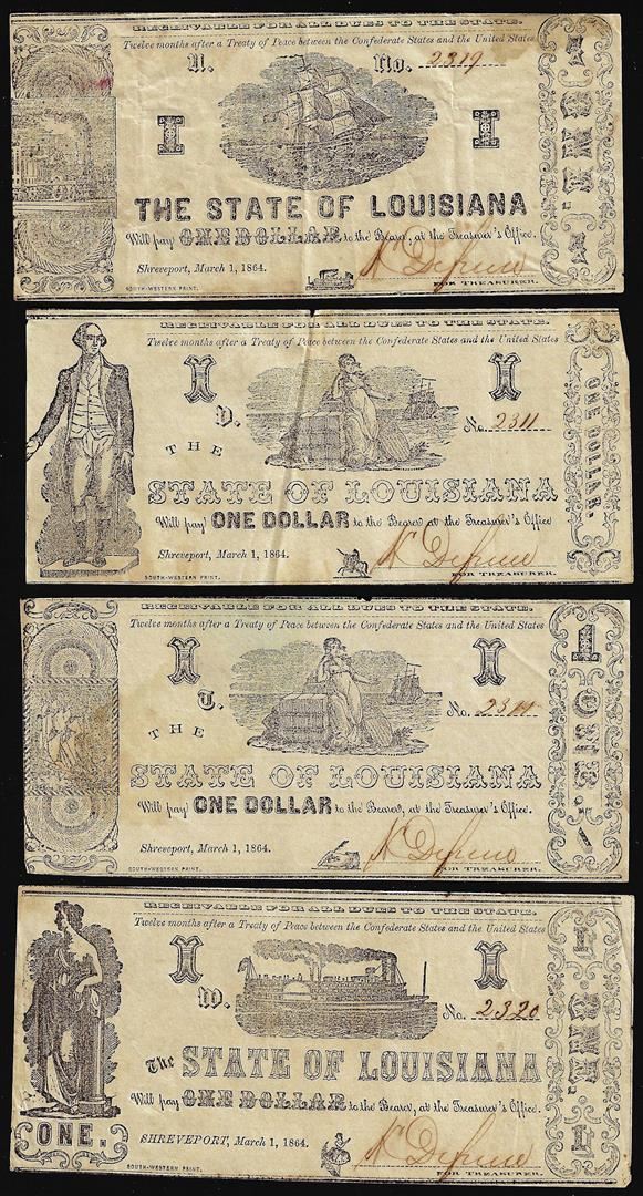 One Lot of (4) 1864 $1 State of Louisiana Obsolete Notes.