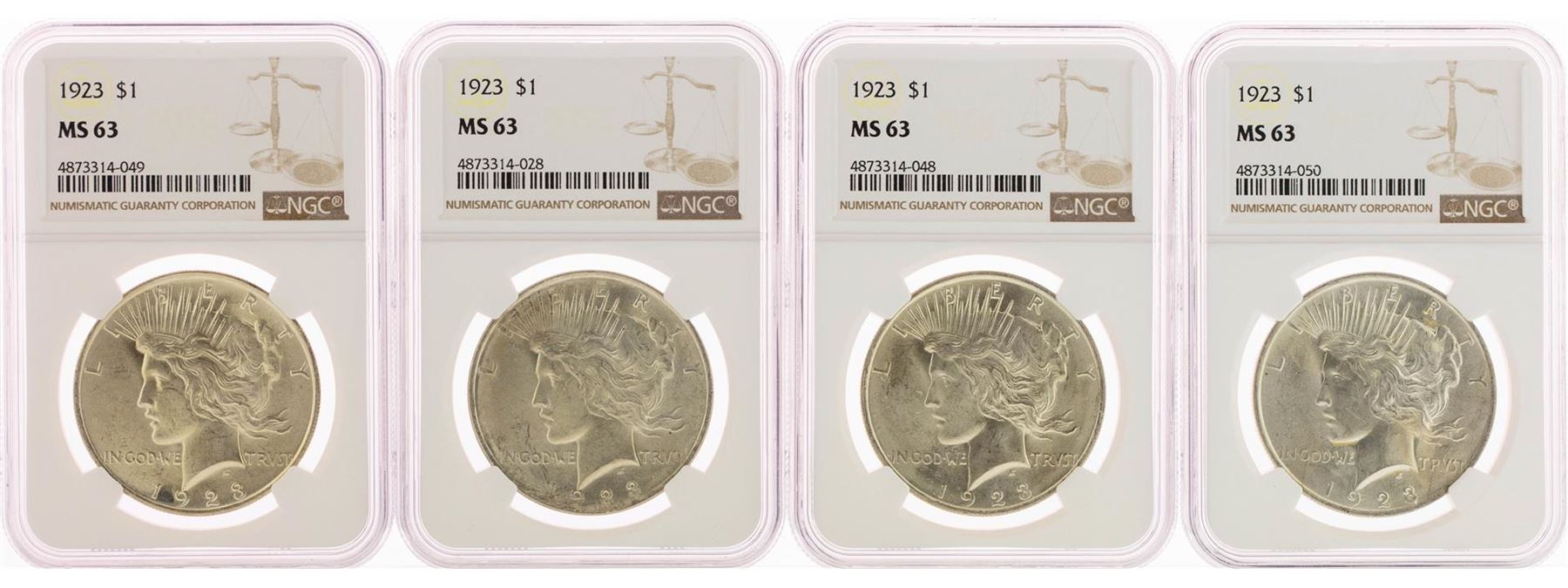 One Lot of (4) 1923 $1 Peace Silver Dollar Coins NGC MS63.