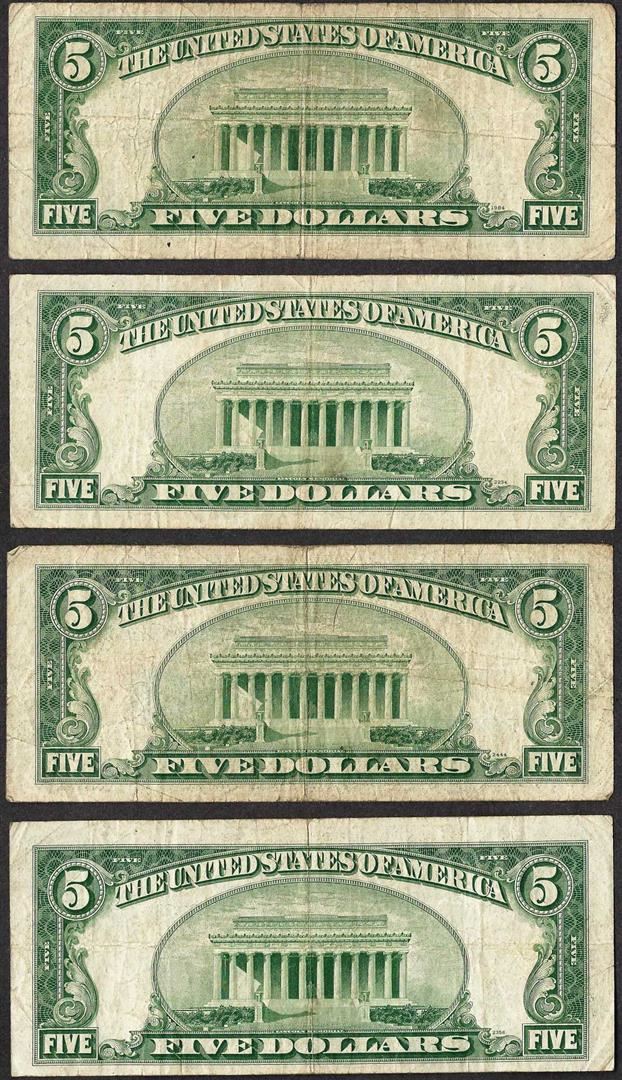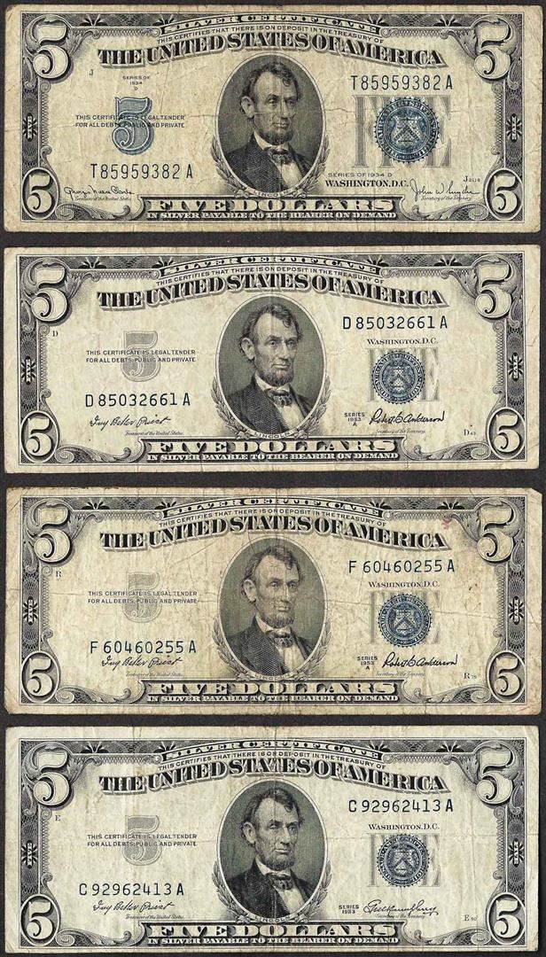 One Lot of (4) 1934/1953 $5 Silver Certificate Notes.