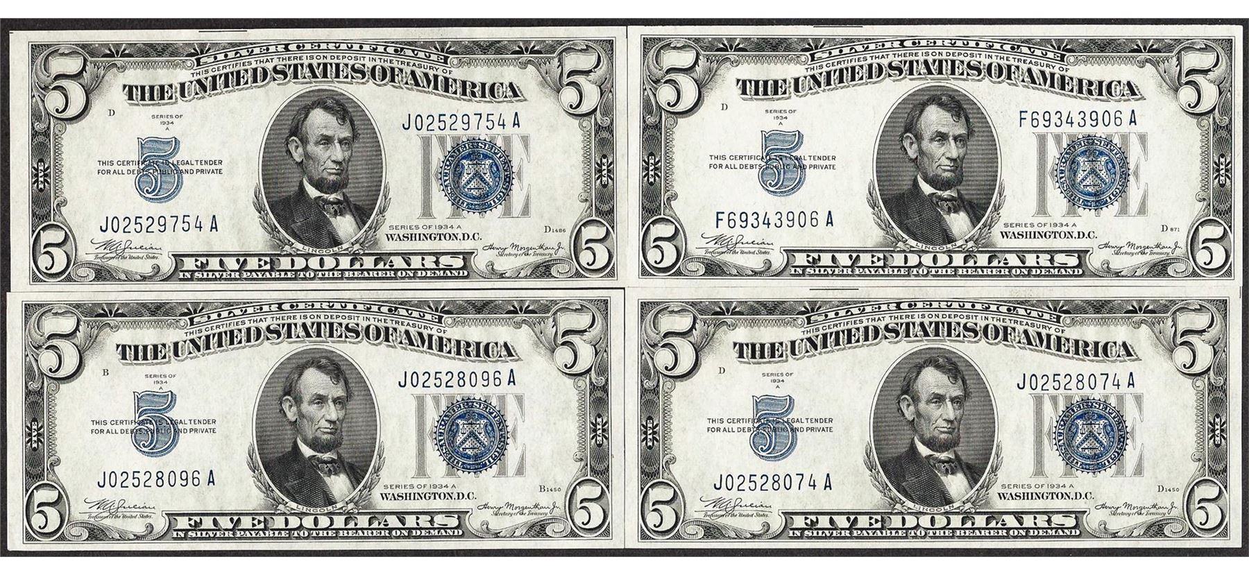 One Lot of (4) 1934A $5 Silver Certificate Notes.