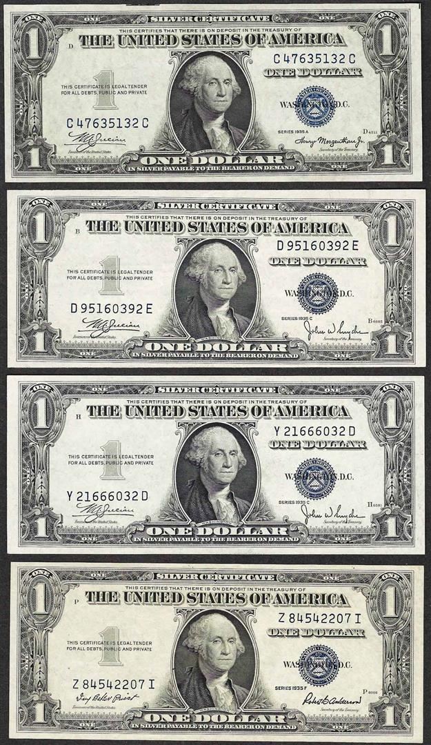 One Lot of (4) 1935 $1 Silver Certificate Notes Uncirculated.