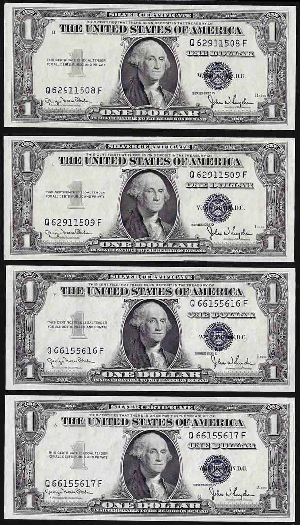 One Lot of (4) 1935D $1 Silver Certificate Notes Wide Uncirculated.