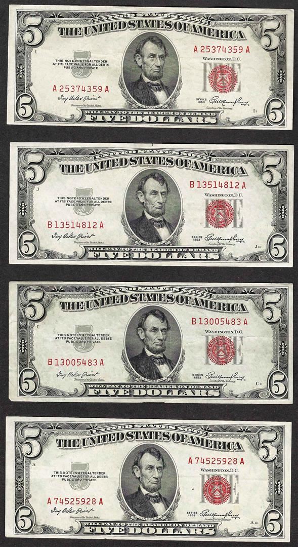 One Lot of (4) 1953 $5 Legal Tender Notes.