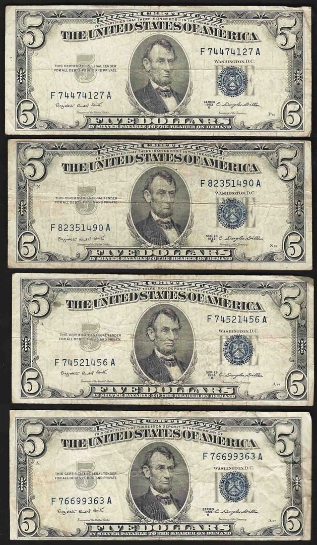 One Lot of (4) 1953 $5 Silver Certificate Notes.