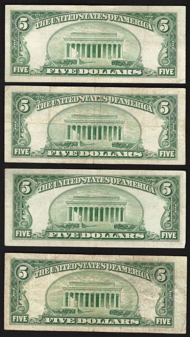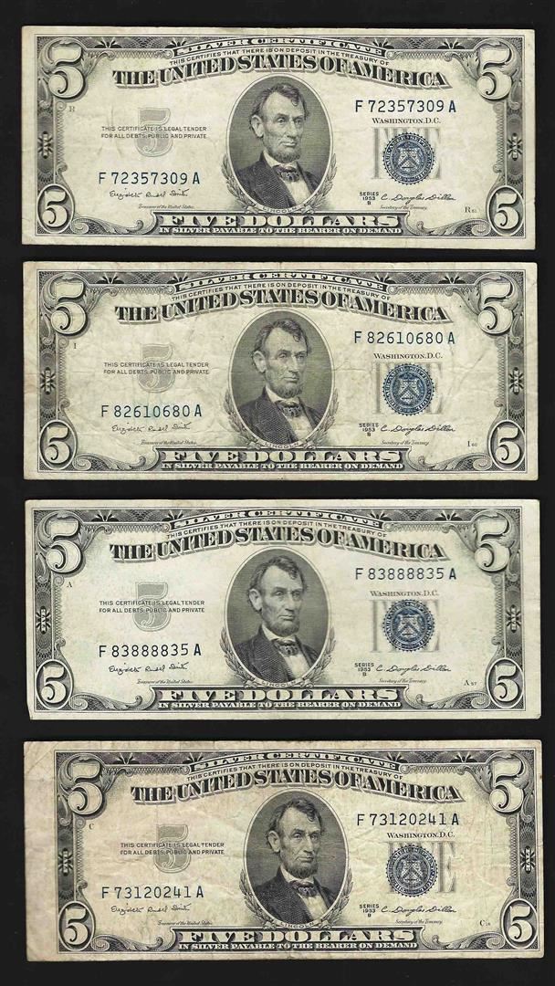 One Lot of (4) 1953B $5 Silver Certificate Notes.