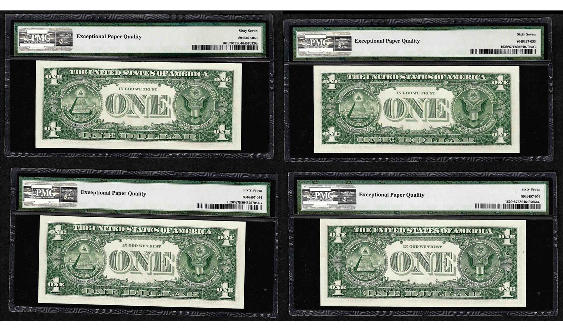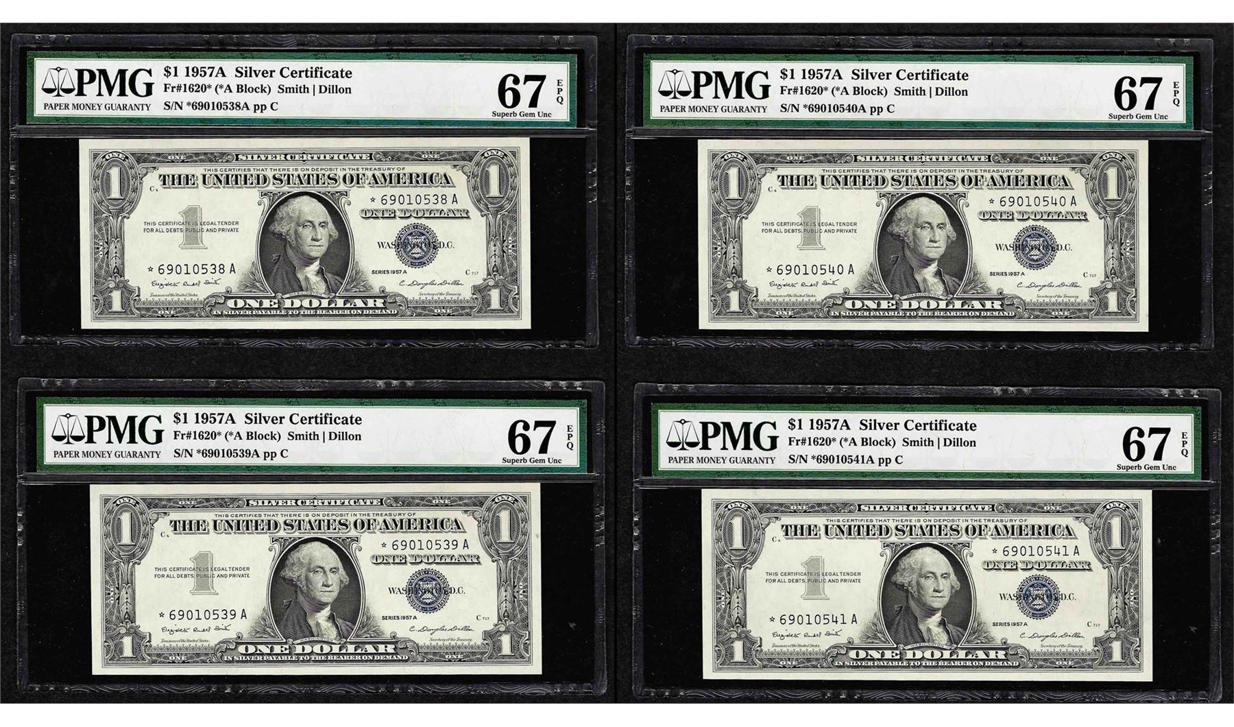 One Lot of (4) 1957A $1 Silver Certificate STAR Notes PMG Superb Gem Uncirculated 67EPQ. PMG Certified.