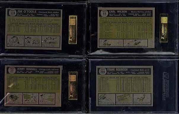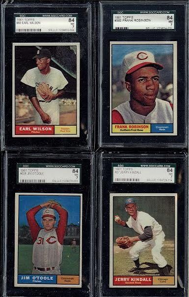 Lot of 4 1961 Topps Cards Robinson, O'Toole, Kindall and Wilson. This lot features #360 Frank Robinson SGC Grade 7, #27 Jerry Kindall SGC 7, #328 Jim O'Toole SGC 7 and Earl Wilson SGC 7
