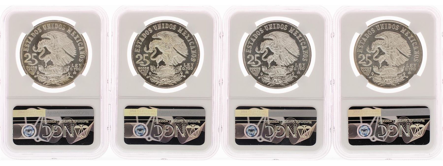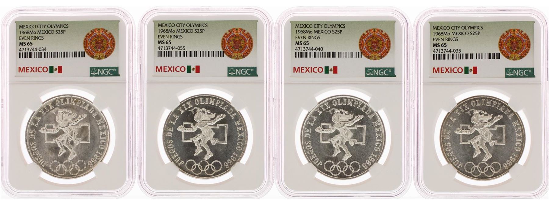 One Lot of (4) 1968Mo Mexico 25 Pesos Olympics Commemorative Silver Coins NGC MS65. NGC Certified.