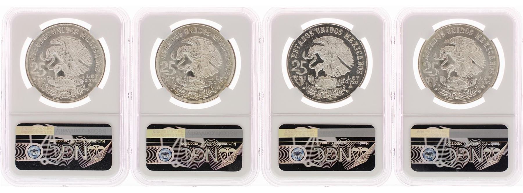 One Lot of (4) 1968Mo Mexico 25 Pesos Olympics Commemorative Silver Coins NGC MS65. NGC Certified.