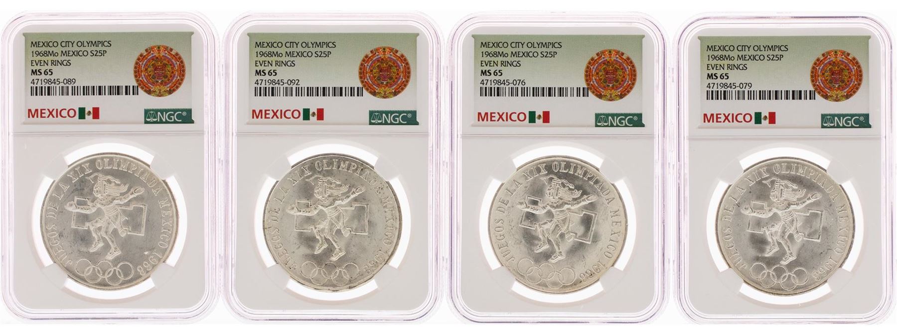 One Lot of (4) 1968Mo Mexico 25 Pesos Olympics Commemorative Silver Coins NGC MS65. NGC Certified.