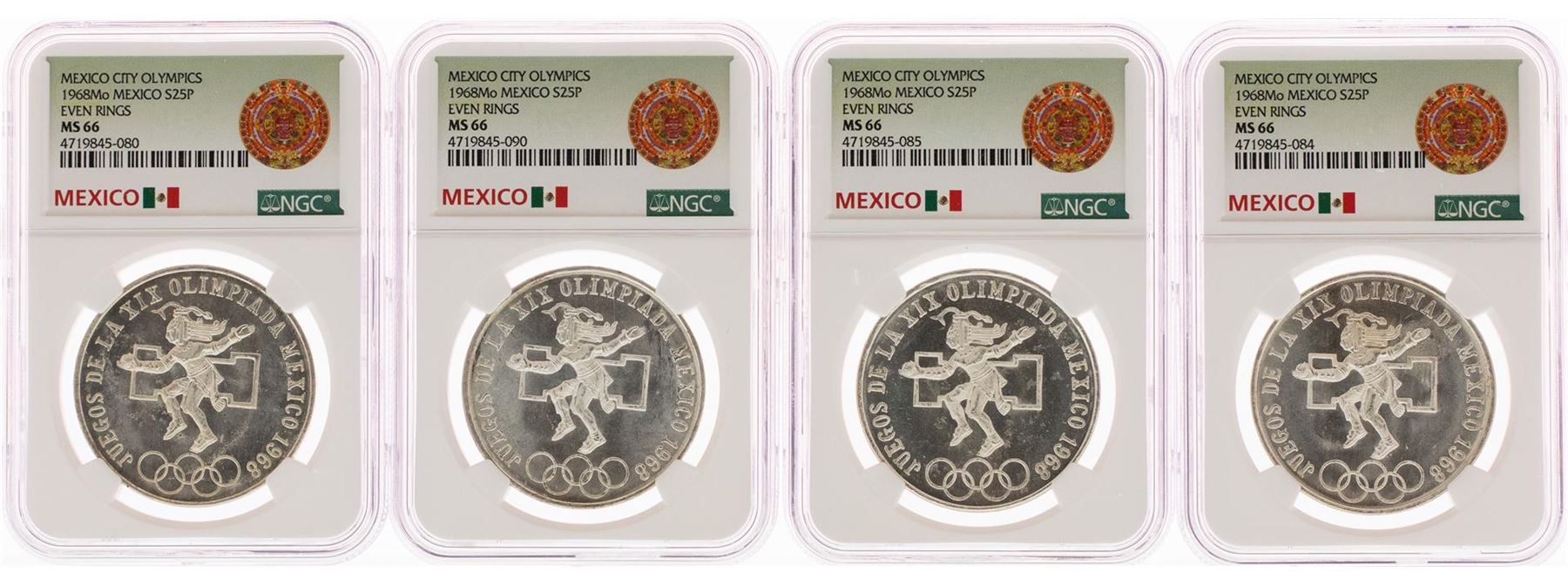 One Lot of (4) 1968Mo Mexico 25 Pesos Olympics Commemorative Silver Coins NGC MS66. NGC Certified.