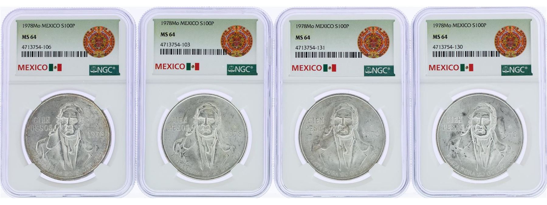 One Lot of (4) 1978Mo Mexico 100 Pesos Silver Coins NGC MS64. NGC Certified.