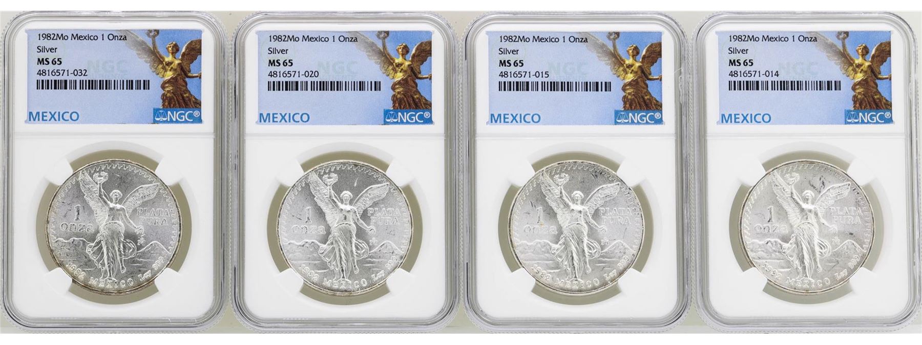 One Lot of (4) 1982Mo Mexico Libertad Onza Silver Coins NGC MS65. NGC Certified.