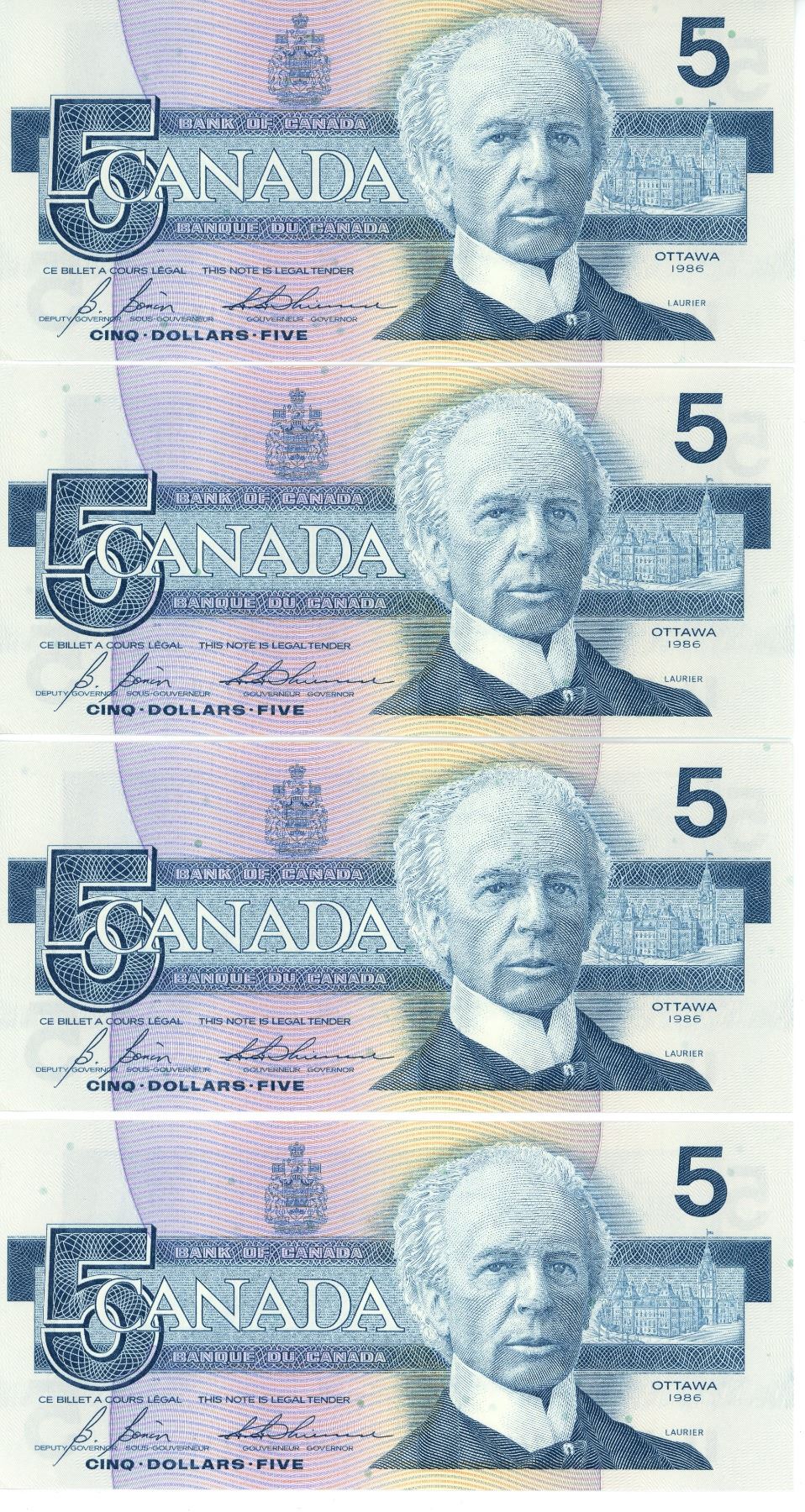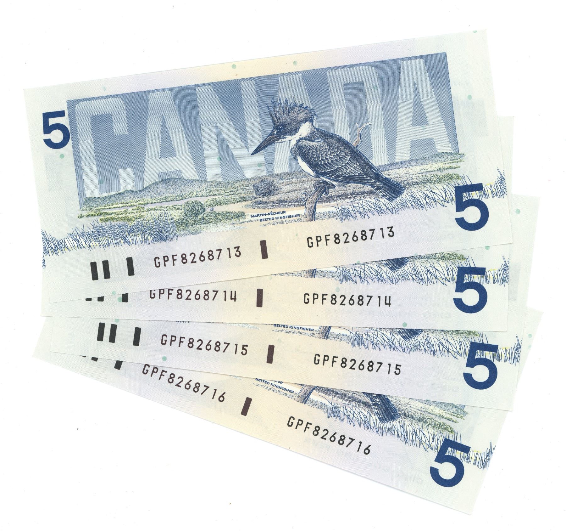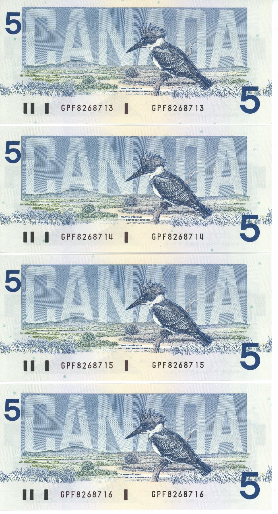 Lot of 4: 1986 Sequential Canada $5 bills, Bonin/Thiessen, # GPF 8268713-716